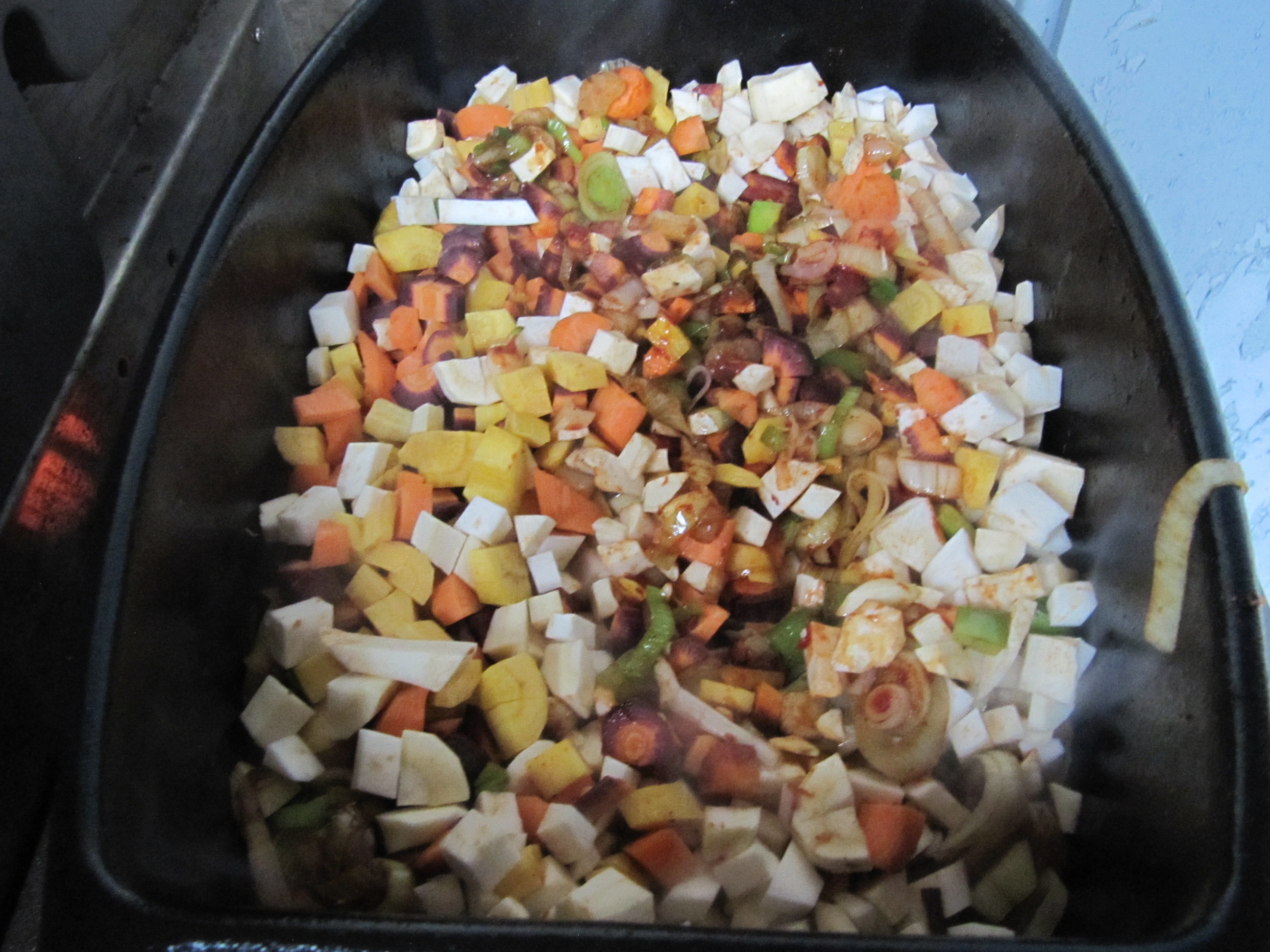 Man kann dieses Gericht natürlich im Dutch Oven unter Verwendung von Briketts zubereiten (5 unten, 15 oben, beim Anbraten alle unten). Zubereitungszeit durch Hitze auch von oben, nur ca. 2 Std.
