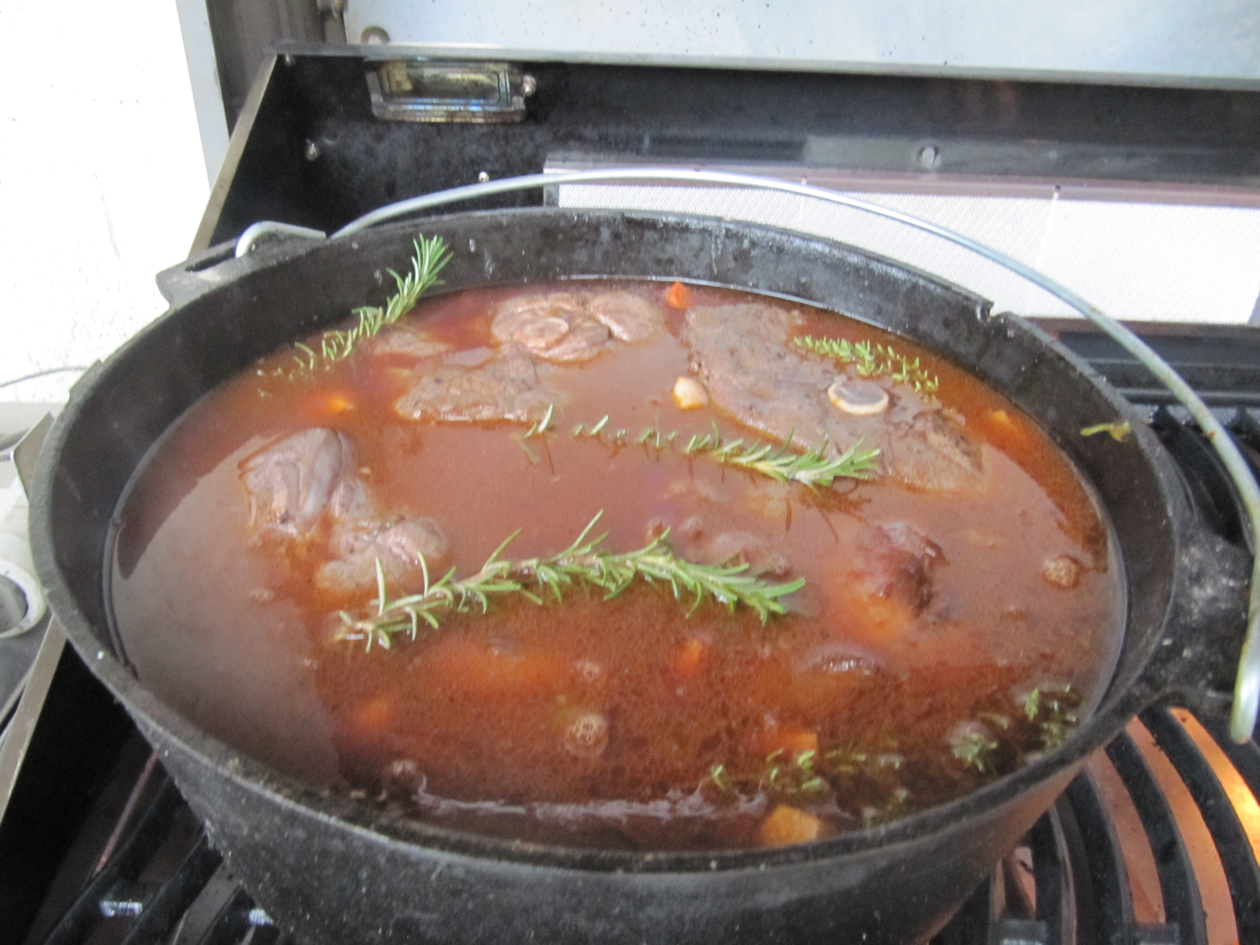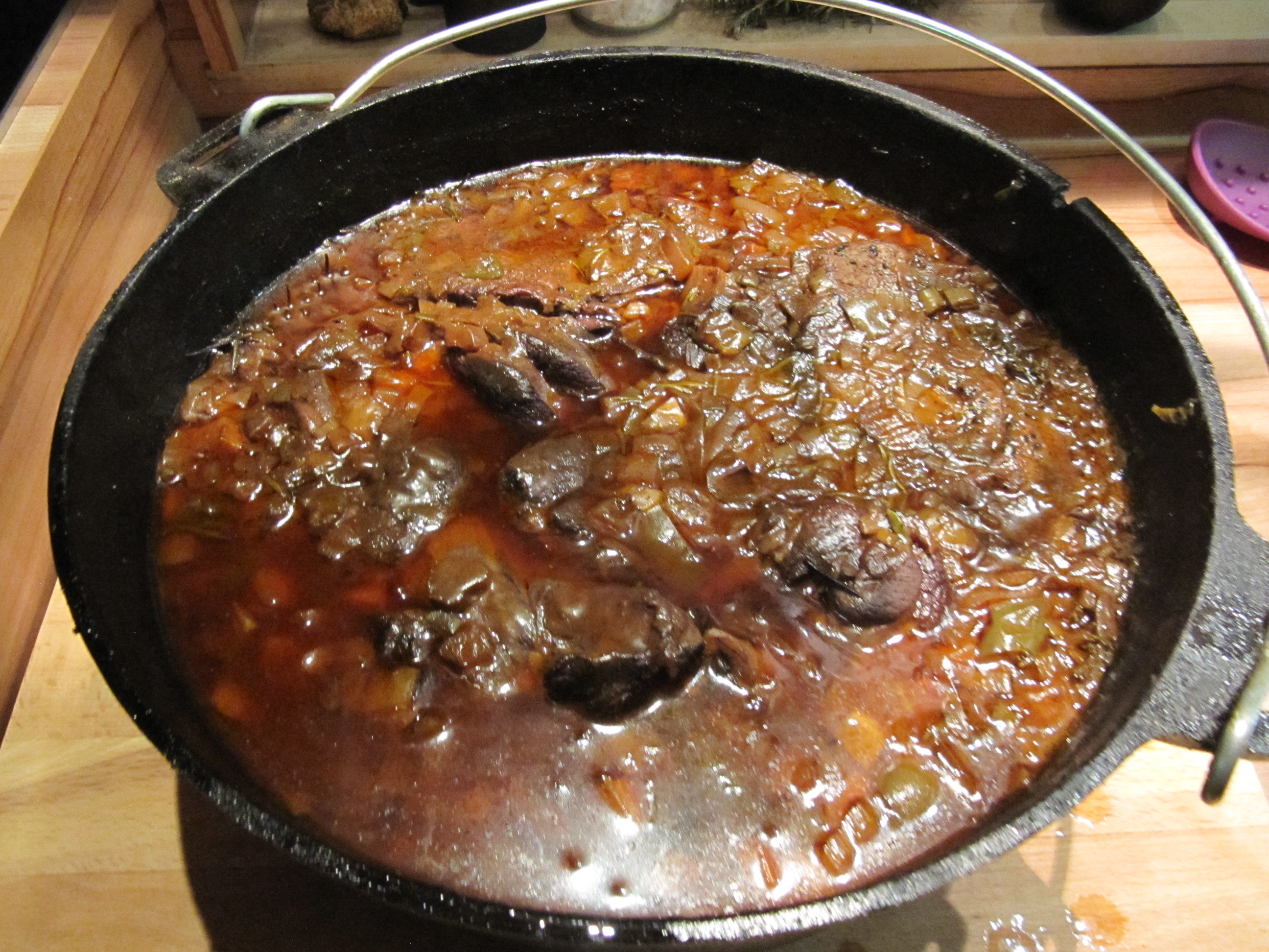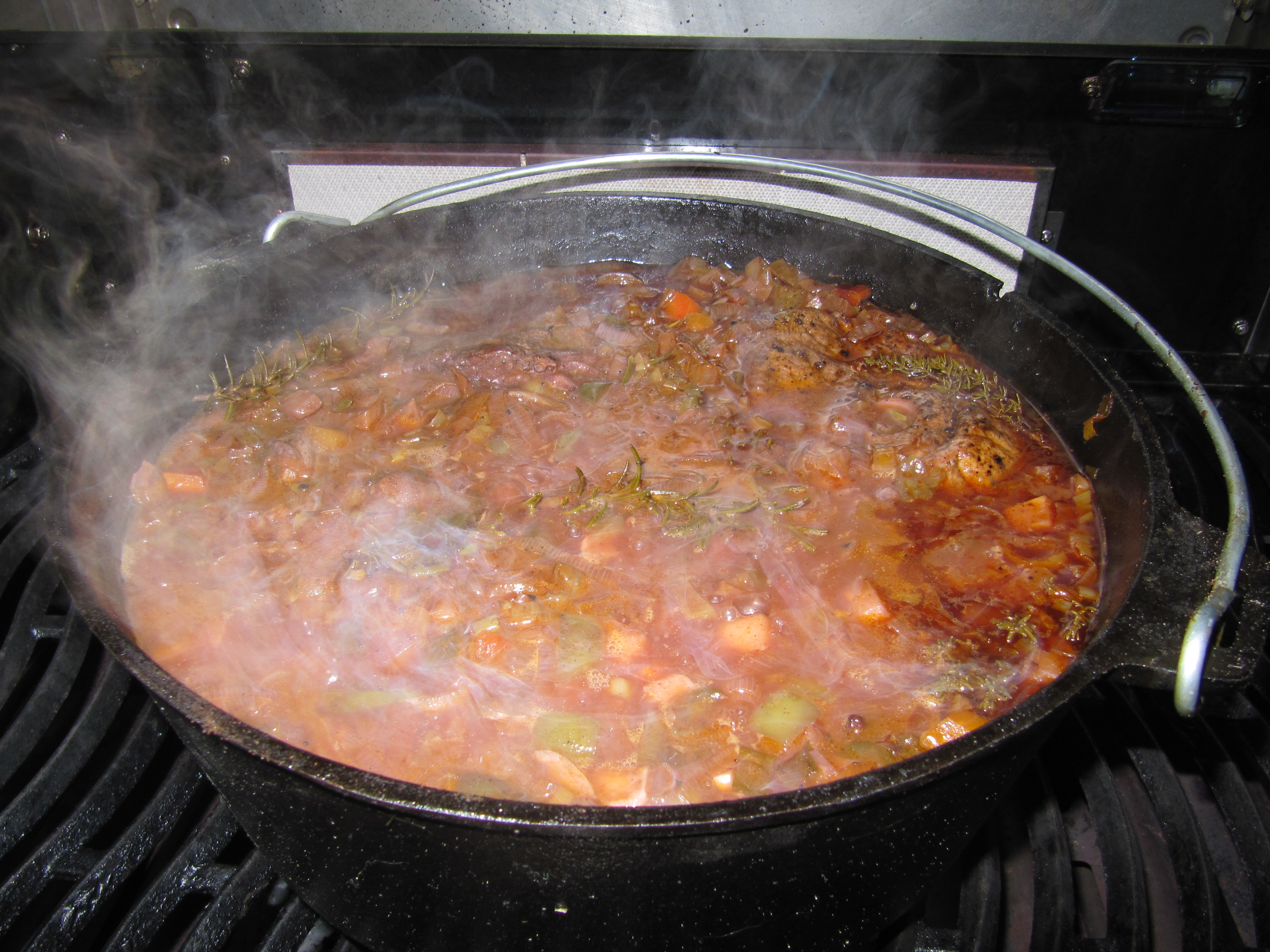 Lammkeulen mit Pfeffer, Salz und Paprikapulver würzen. Butter und Olivenöl im Dutch-Oven (in meinem Fall: gußeisener Bräter auf der Sizzle-Zone des Gasgrills) erhitzen, und die Keulen darin von allen Seiten scharf anbraten. Fleisch rausnehmen und beiseite stellen. Kleingeschnittenes Gemüse mit Knoblauch und Tomatenmark anbraten, mit den Lammkeulen in den Dutch Oven geben und mit Rotwein ablöschen. Brühe oder Fond angießen, daß Keulen knapp bedeckt sind. Kräuterzweige dazugeben und alles mit Salz, Pfeffer und Worcestershiresauce abschmecken. Deckel schließen und 3 Std. köcheln lassen, bis sich das Fleisch von den Knochen löst. (Vorsicht : In Südafrika wird dieses Gericht niemals umgerührt !) Immer wieder Flüssigkeitstand im Topf überprüfen und nachgießen. Wer eine kräftige Sauce wünscht, sollte Fleisch und Gemüse vorsichtig aus dem Topf nehmen und warmhalten. Flüssigkeit abseihen und bei starker Hitze reduzieren lassen. Mit knusprigem Weißbrot servieren. Schmeckt einfach köstlich, Fleisch ist butterzart. Obwohl meine Gattin kein Lamm mag, hat ihr dieses Gericht sehr gut geschmeckt ! Ein selbstgemachter Zirbenschnaps danach mußte einfach sein !