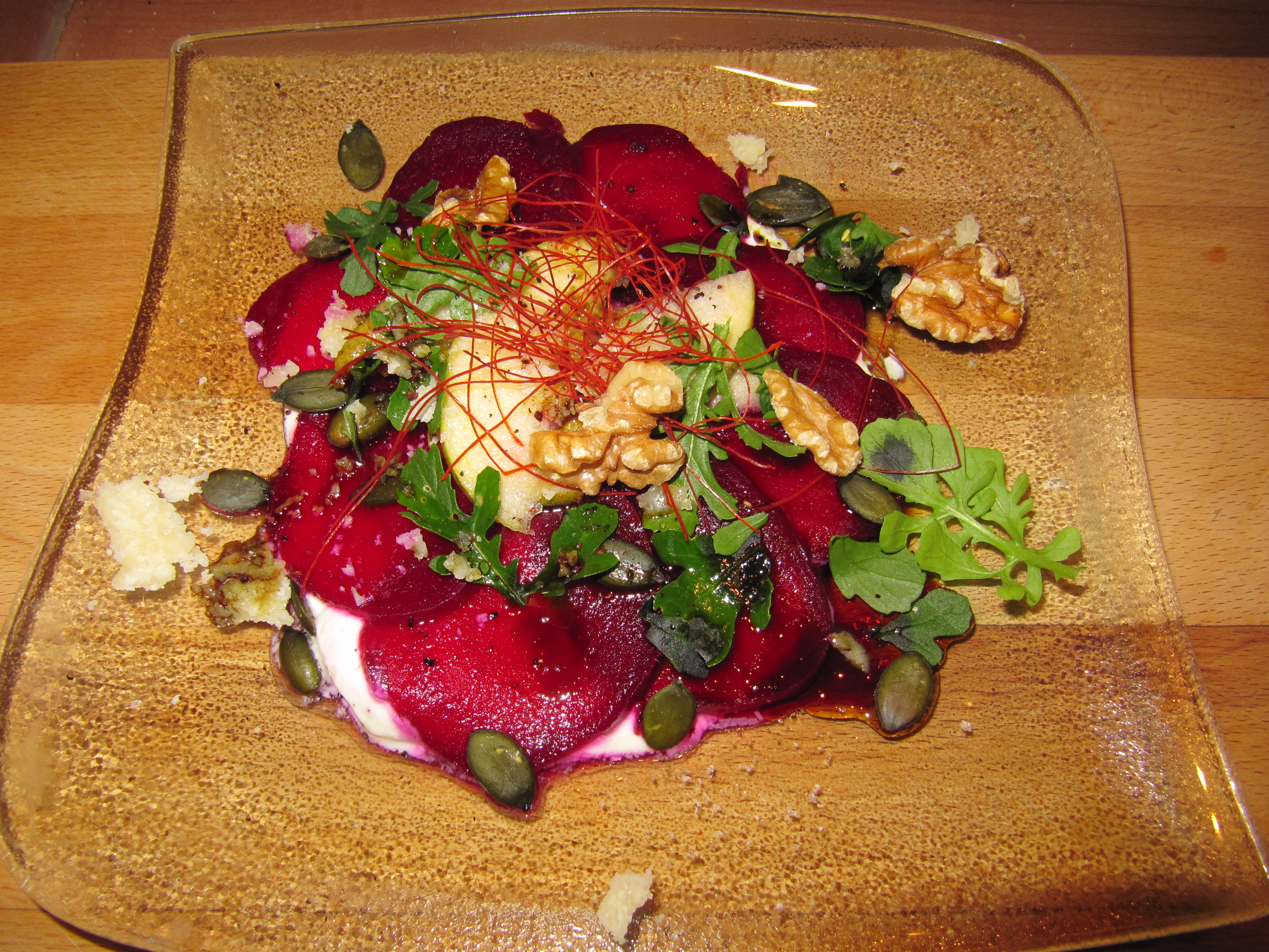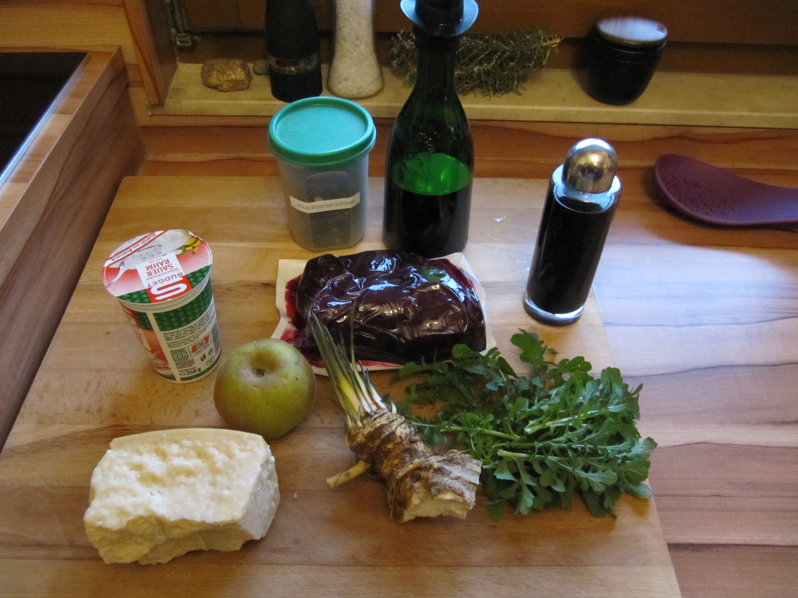 4 Rote Rüben (rote Bete), 1 säuerlicher Apfel, 1 Becher Sauerrahm, 2 EL geriebener Kren (Meerrettich), 1 EL geriebene Zitronenschale, etwas Fleur de Sel, 50ml Kürbiskernöl, 2 EL weißer Balsamico, Pfeffer und etwas Rucola als Topping, 1 EL Kürbiskerne geröstet, Walnüsse, etwas Parmesan gehobelt, Chilifäden.