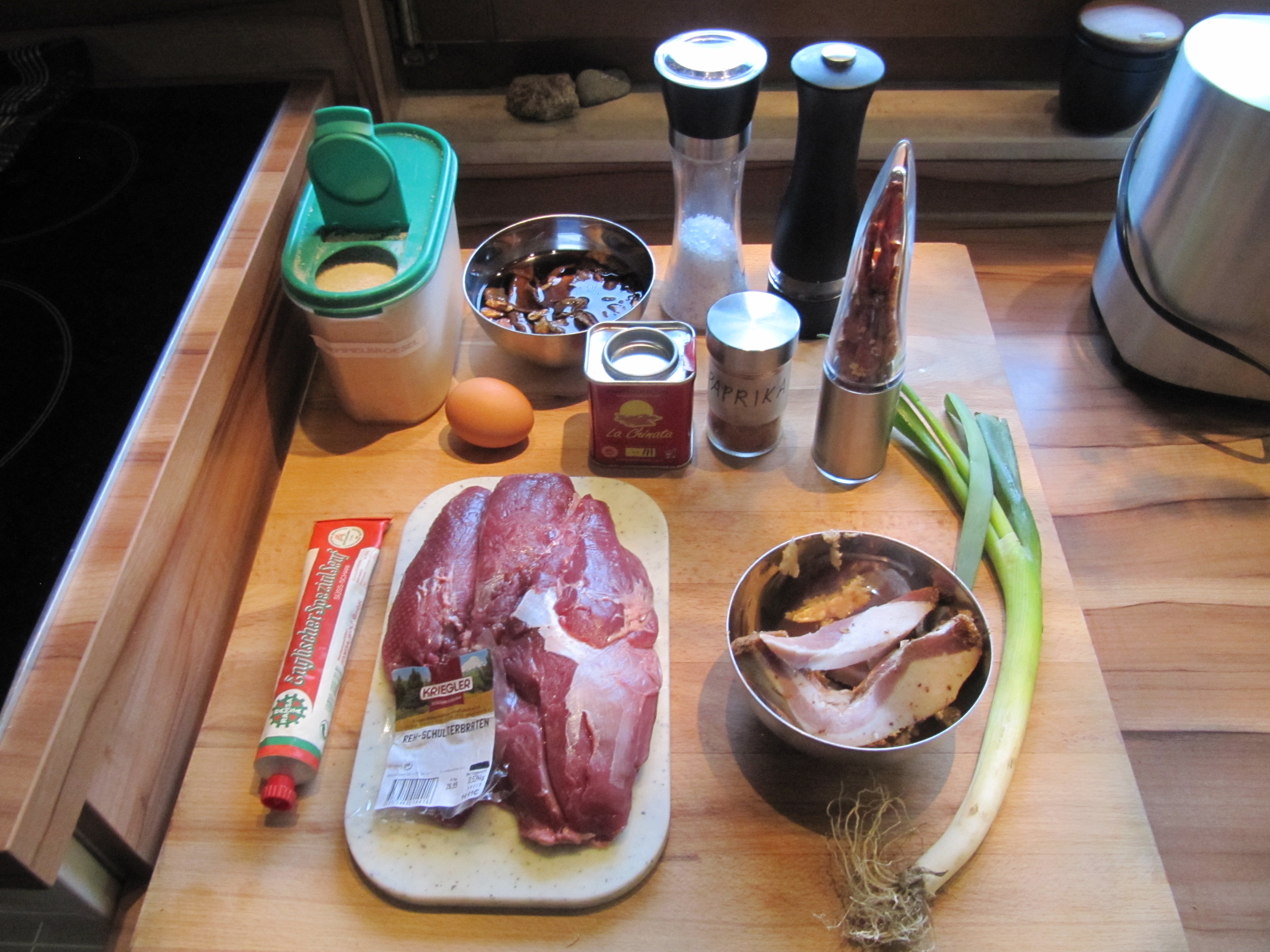 500 g Fleisch vom Reh, z.B. Schulter, 100 g fetter, geräucherter Bauch-Speck, 50 g Semmelbrösel, 1 Ei, 1 EL Senf, Salz, Pfeffer aus der Mühle, Paprikapulver (edelsüß oder geräuchert), Chili aus dem Chilischneider oder fein gehackt (wer´s scharf mag!), 1 Lauchzwiebel fein gehackt, 1 EL getrocknete Steinpilze 2 Std. in heißem Wasser einweichen, abgießen und fein hacken, etwas Camembert, Preiselbeerkompott, Himbeersenf von Honigschaf.