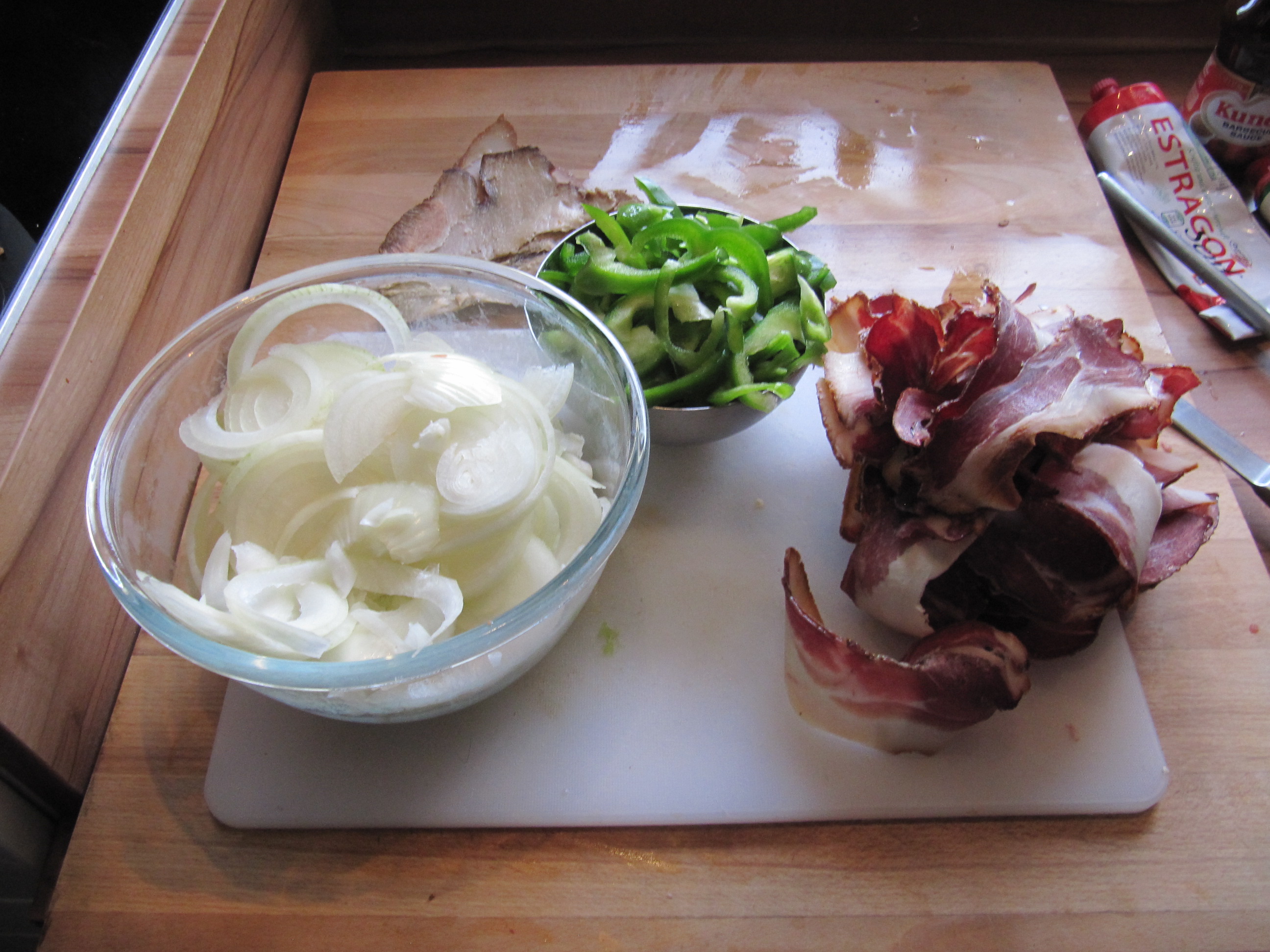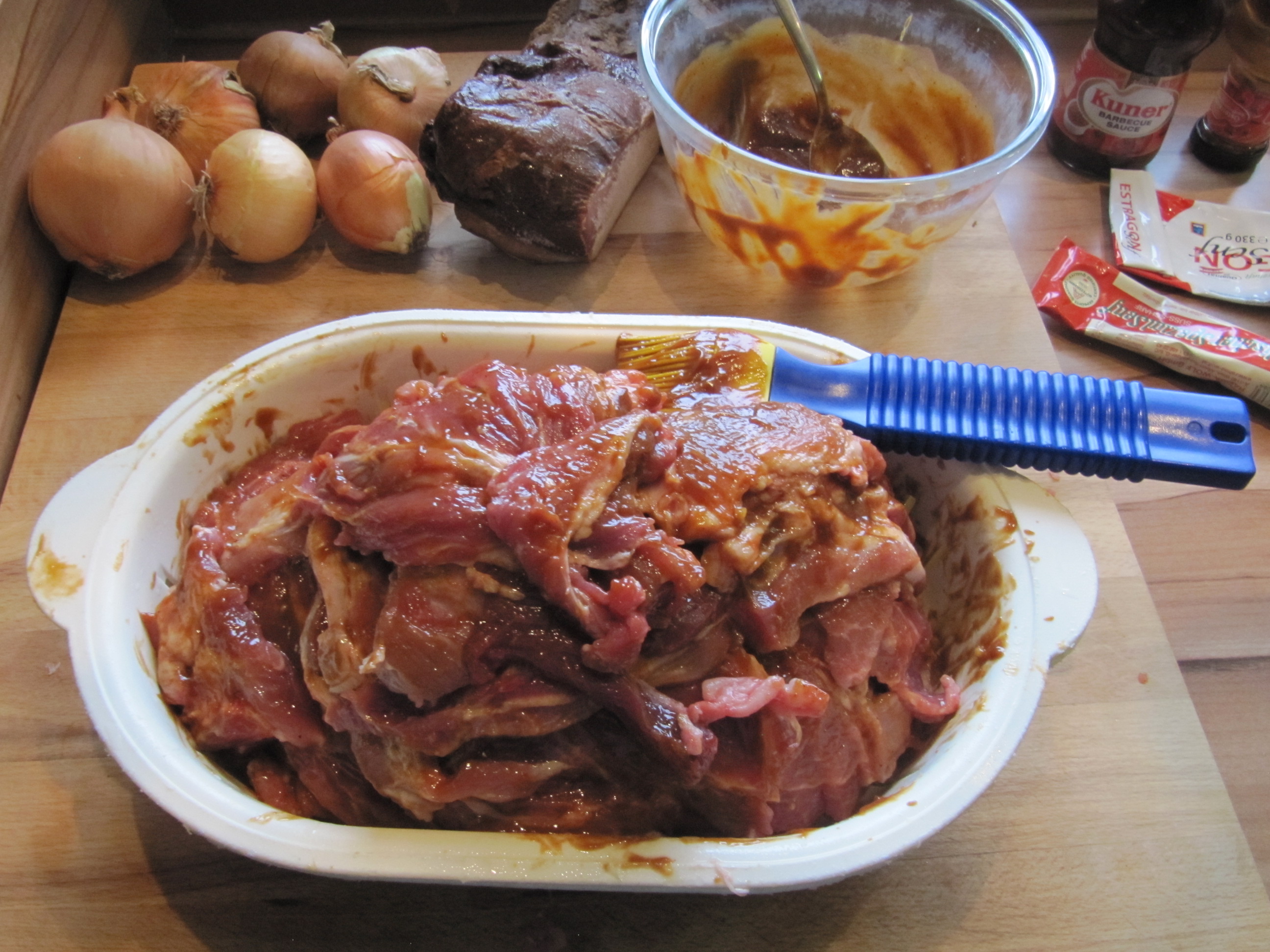 2,5 kg Schweineschopf- (Nacken) oder Schulterbraten ohne Knochen, 5 Gemüsezwiebeln, 2 grüne Paprikaschoten, 600 g Bauchspeck in dünne Scheiben geschnitten, Gewürzmischung nach Geschmack (z.B. ADI´S Rub Schwein) 3 EL mittelscharfer Senf (ich habe 2 1/2 EL Estragon- mit 1/2 EL Englischen- Senf gemischt) BBQ Sauce (Produkt und Menge nach Geschmack), etwas Whiskey 1/2 EL Knoblauchpaste, 2 TL Chiliöl.