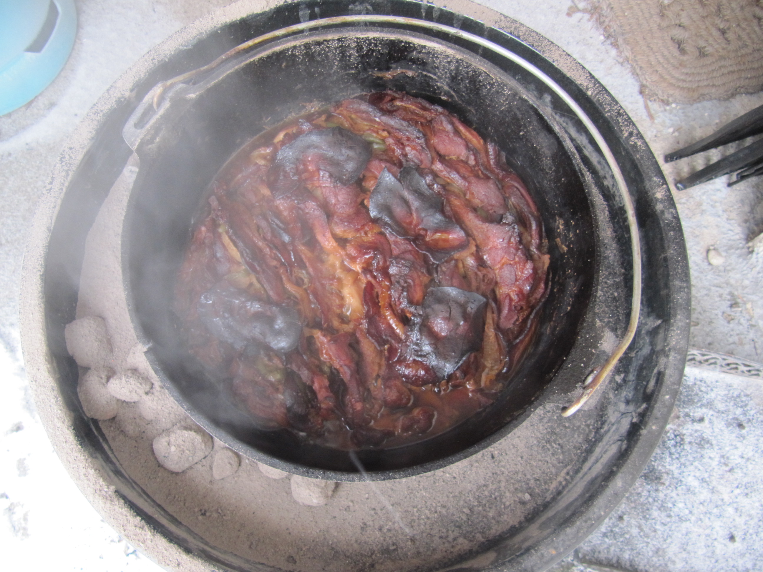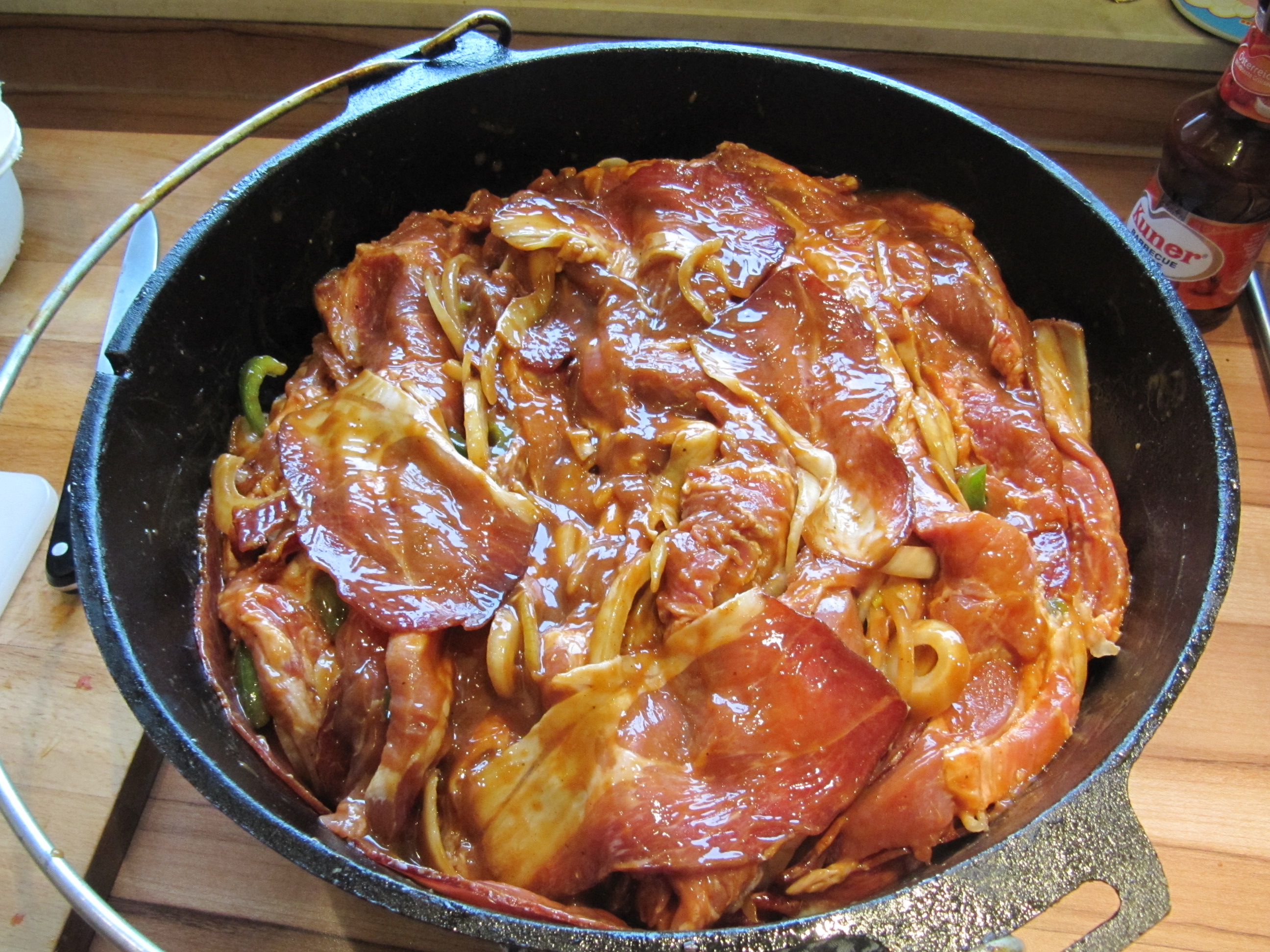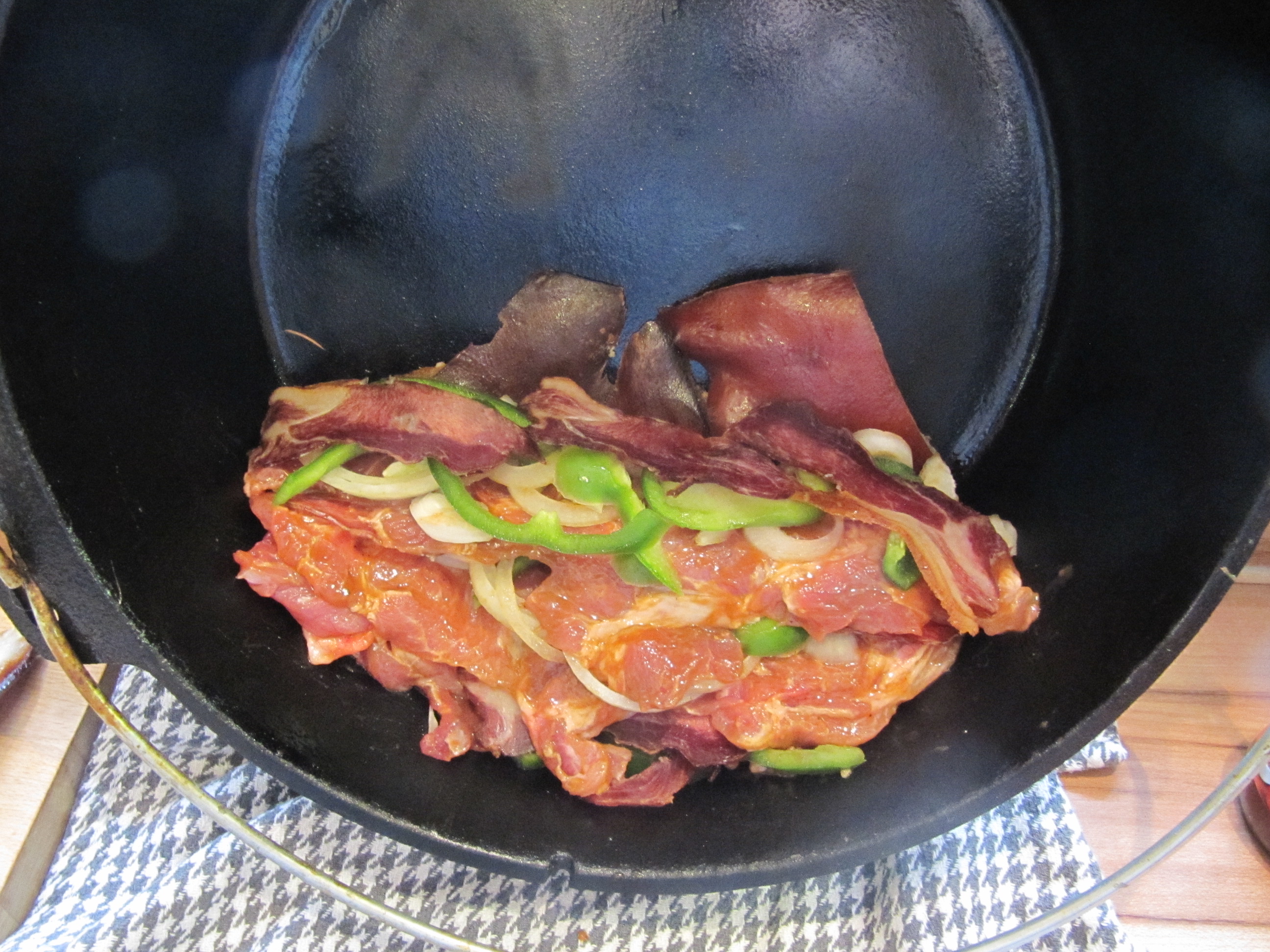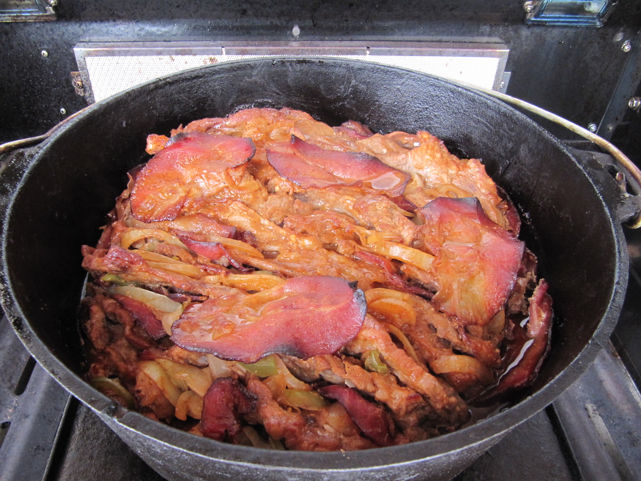Schweineschopf- (oder Schulter-) braten in ca. 1,5 cm dicke Scheiben schneiden. Eine Paste aus Senf, BBQ-Sauce, Knoblauchpaste, Chiliöl und Gewürzen (ein Schuß Whiskey schmeckt auch sehr gut dazu) herstellen und die Fleischscheiben damit einpinseln. Etwas ziehen lassen. Gemüsezwiebeln schälen und in ca. 0,5 cm dicke Scheiben schneiden. Auch Paprikaschoten in gleich große Scheiben schneiden. DO mit Rapsöl einfetten, den Boden mit Bauchspeckscheiben (oder Speckschwarten) auslegen und für das Befüllen mit der Unterseite gegen einen stabilen Gegenstand stellen. Nun abwechselnd das gewürzte Fleisch, die Zwiebel- , Paprikascheiben und dünne Bauchspeckscheiben vertikal in den DO schichten, bis er gefüllt ist. Den Topf wieder auf die Füße stellen und mit einer Schicht Bauchspeckscheiben belegen. Als Abschluß den Rest der Würzpaste darüber verteilen. (sonst nichts zugeben, es bildet sich ausreichend Sauce durch Fleisch und Zwiebeln !) Für den 12 “ Dutch-Oven 24 Briketts vorglühen, 10 darunter, oben drauf 14 Briketts legen. Je nach Größe der Kohlen und Witterung sollten sie für 2,5 Stunden köcheln ausreichen. (sonst vorgeglühte Briketts nachlegen !) Die Gartemperatur beträgt 180 °C, nach einer Garzeit von ca. 2,5 Stunden ist das Schichtfleisch fertig. Mit Serviettenknödel und Krautsalat servieren. Dazu schmeckt ein kühles Bier (z.B. Mastri Birrai Umbri). (Tipp wenn´s zuviel geworden ist: Diese Gerichte im Dutch Oven schmecken auch aufgewärmt hervorragend !) Es passt auch ein knuspriges Baguettebrot sehr gut dazu !
