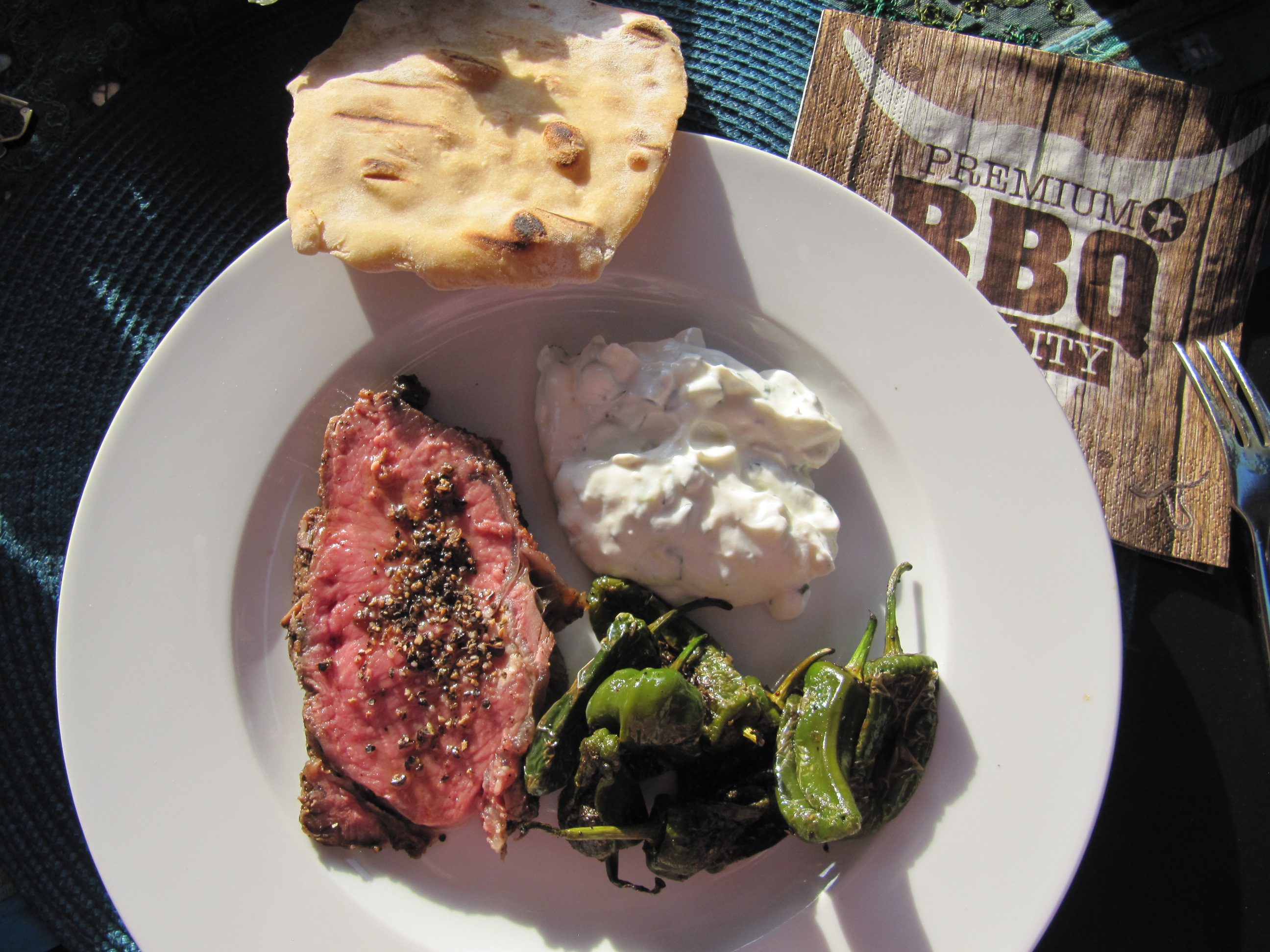 heute gibt´s ein zartrosa Roastbeef mit Tzatziki, selbstgebackenem Fladenbrot und Pimentos. Dazu einen frischen Salat aus dem Garten. Die süßen Frühlingsrollen zum Dessert schmeckten traumhaft gut !