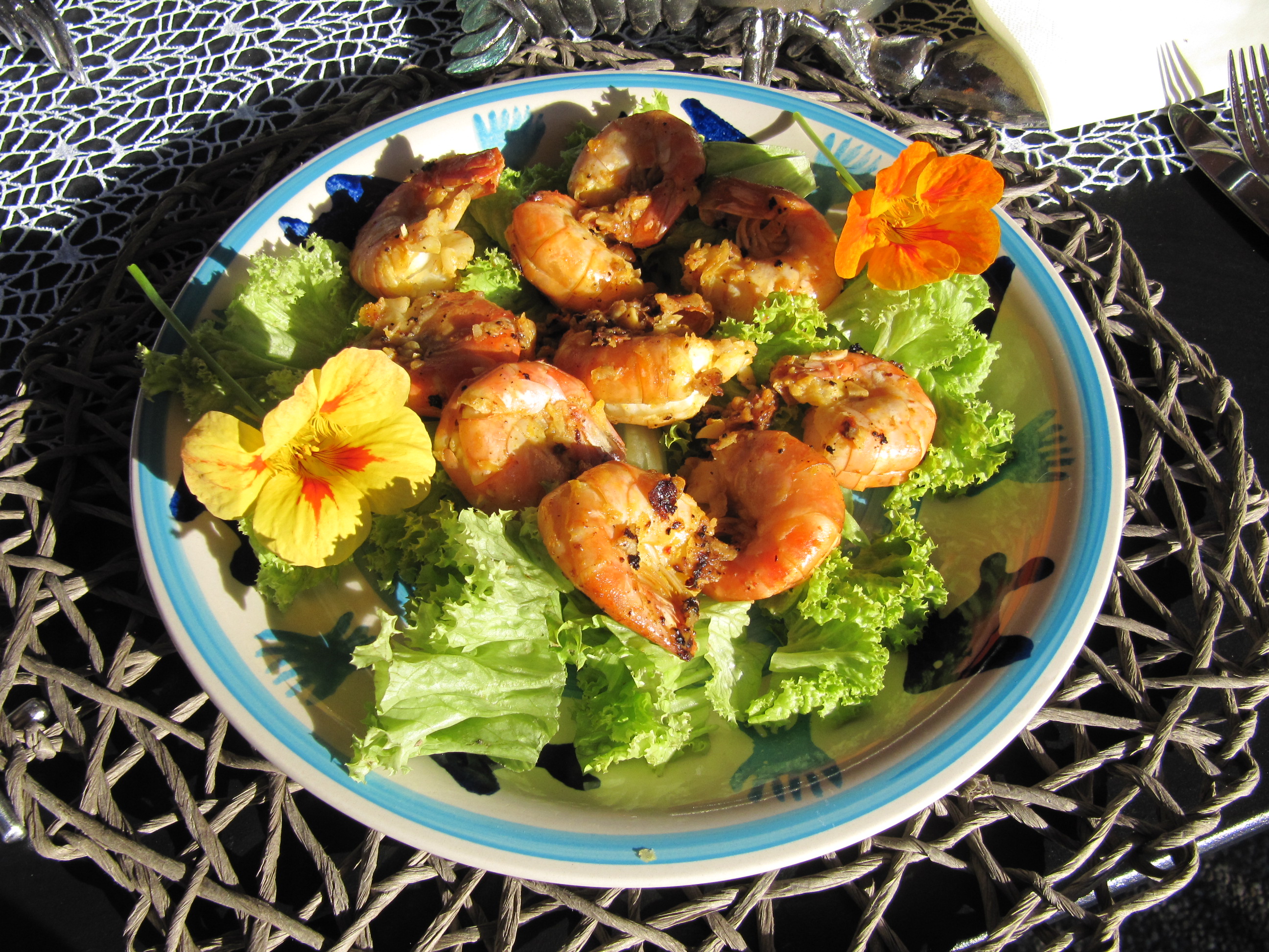 heute gibt´s Butterfly-Garnelen mit einer fruchtig scharfen Marinade auf Blattsalat aus dem Garten !