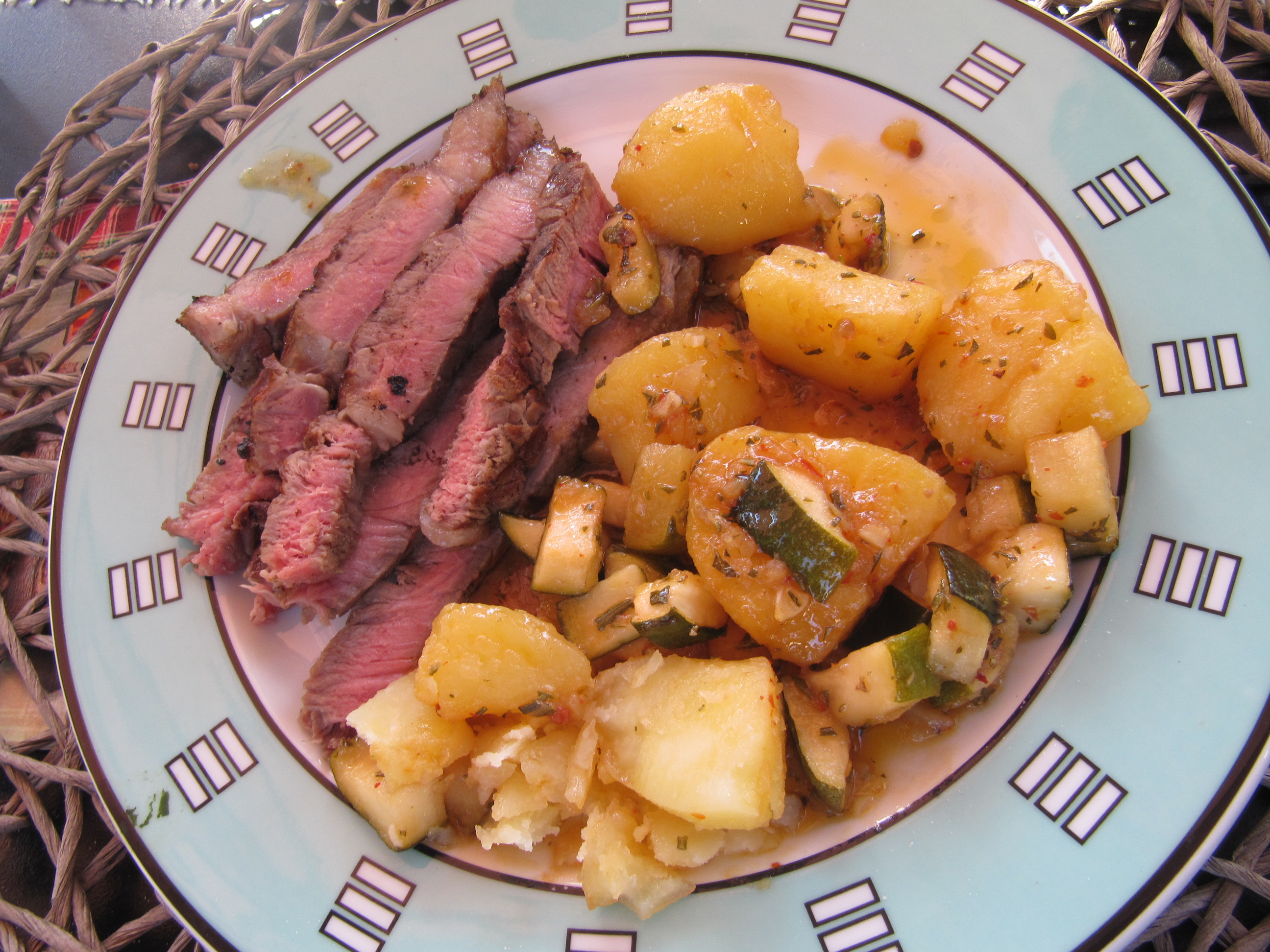 heute gibt´s drei köstliche Steaks ( 1x T-Bone, 1x Porterhouse und 1x Primesteak), dazu marinierte Kartoffeln mit Zucchini. Die Vorspeise bestand aus marinierten und gegrillten Garnelen, das Weißbrot (Ciabatta) wurde von meiner Gattin zubereitet. Auch beim Dessert hat sie die Cheesecakes zubereitet (alles zu finden auf ihrem Blog: „gourmeetme„). Die gegrillten und karamellisierten Ananas-Spieße dazu sind wieder eine „Grillpate“ Zubereitung. Das ganze Menü hat uns, und unseren Gästen, hervorragend geschmeckt !