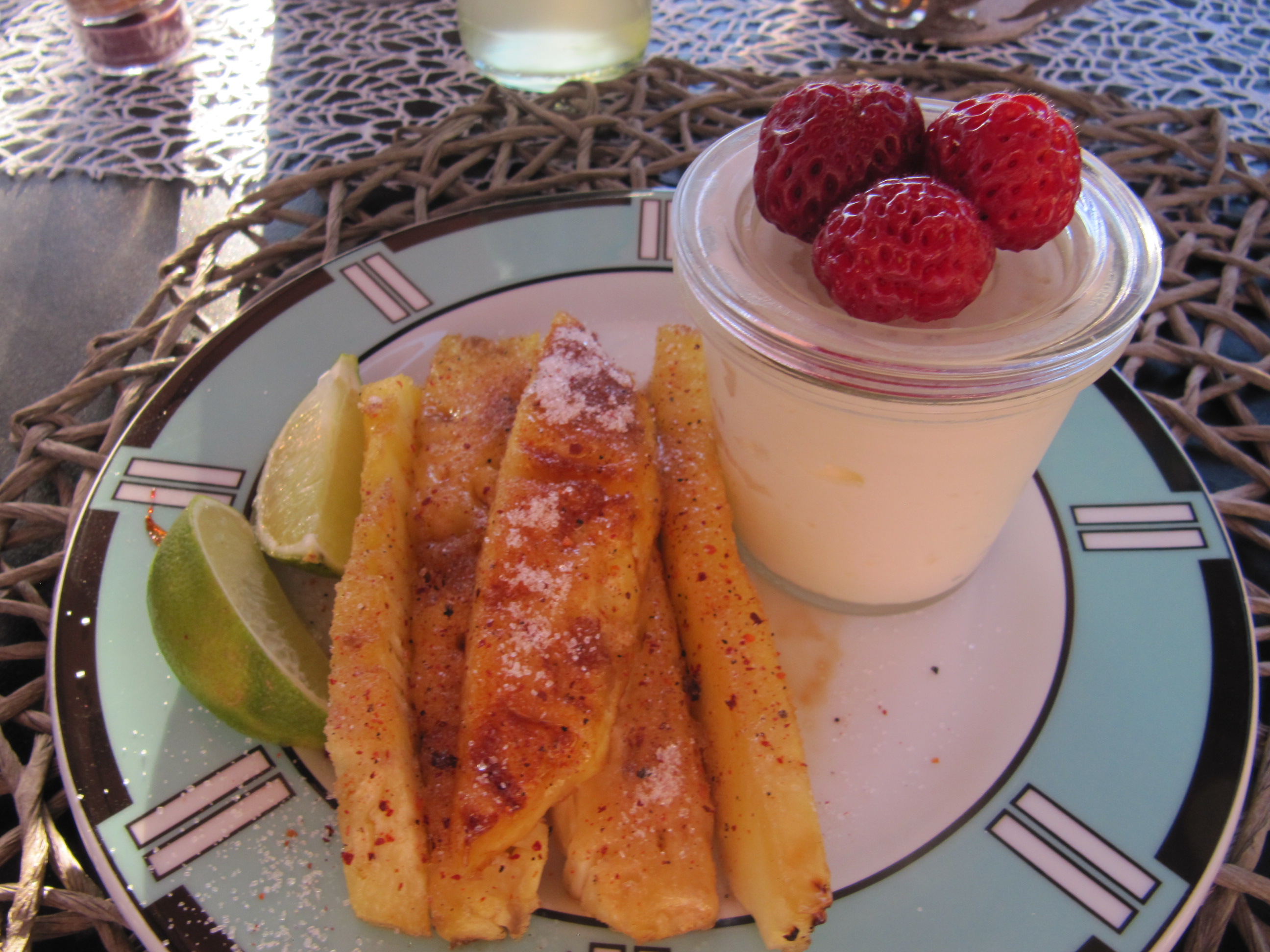 Holzspieße ca. 30 Min. in Wasser einweichen. Für das Chili-Zucker-Salz den Kristallzucker mit Salz, Chilipulver und Piment d´Espelette verrühren und beiseitestellen. Ananas schälen, den Strunk entfernen, das Fruchtfleisch in Streifen schneiden (ca. 5 cm lang, 2 cm breit und 2 cm dick) und auf Spieße stecken. Den Rohrzucker auf einem Backblech verteilen und die Ananasspieße auf beiden Seiten in den Zucker pressen bis sie gut mit Zucker bedeckt sind. Napoleon Gußeisen-Wendeplatte auf mittlere Temperatur erhitzen und die Spieße unter gelegentlichem Wenden 5-6 Min. grillen, bis sie weich und karamellisiert sind. Limette in Spalten schneiden. Die Spieße auf vier Teller geben, mit Ahornsirup begießen, mit Chili-Zucker-Salz bestreuen und mit Limettenspalten anrichten. Cheesecakes mit Früchten dekorieren und zu den Ananasspießen servieren !