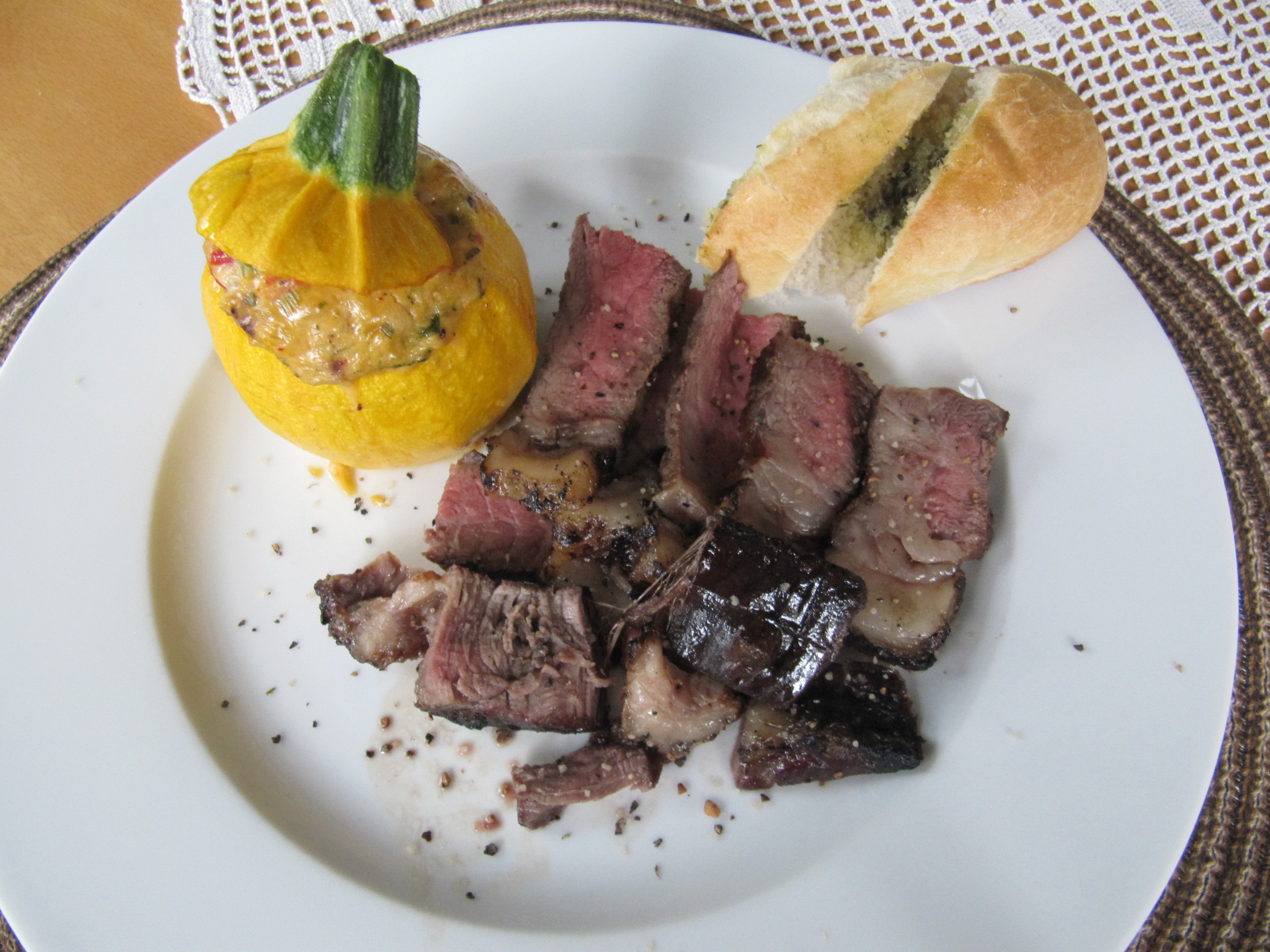 heute gibt´s ein Dry-Aged T-Bone-Steak rückwärts gegrillt. Ich hatte ein einzigartiges Steakfleisch zur Verfügung. Es wurde bei meinem Arbeitgeber „Grillheaven“ 7 Wochen lang am Knochen im Dry-Ager-Schrank trocken gereift. Da im Garten schon 3 Stück gelbe runde Zucchinis (Rondini) geerntet wurden, habe ich diese zu einer köstlichen, vegetarischen Beilage verarbeitet. Die Rondinis wurden mit Frischkäse gefüllt. (Rückwärts grillen bringt´s wirklich und ist für diese gute Fleischqualität eine würdige Zubereitung !)