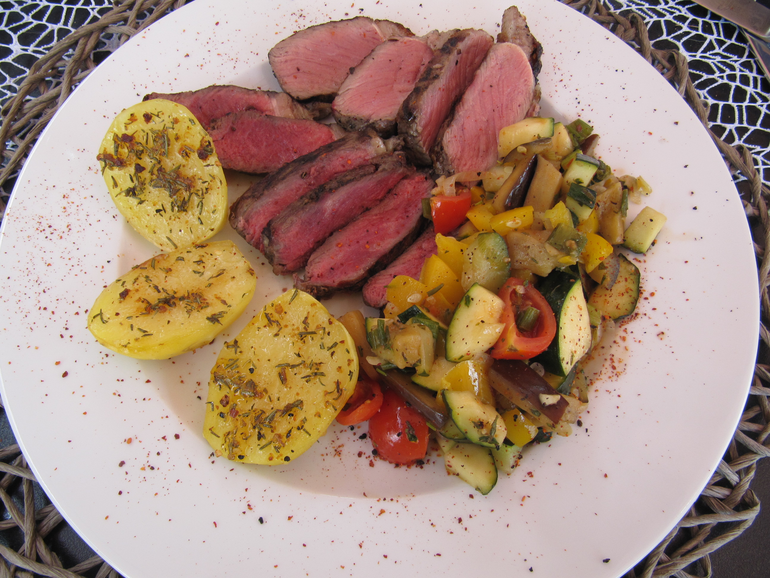 Das Steakfleisch mit den Rosmarin-Kartoffeln und dem mediterranen Gemüse servieren.