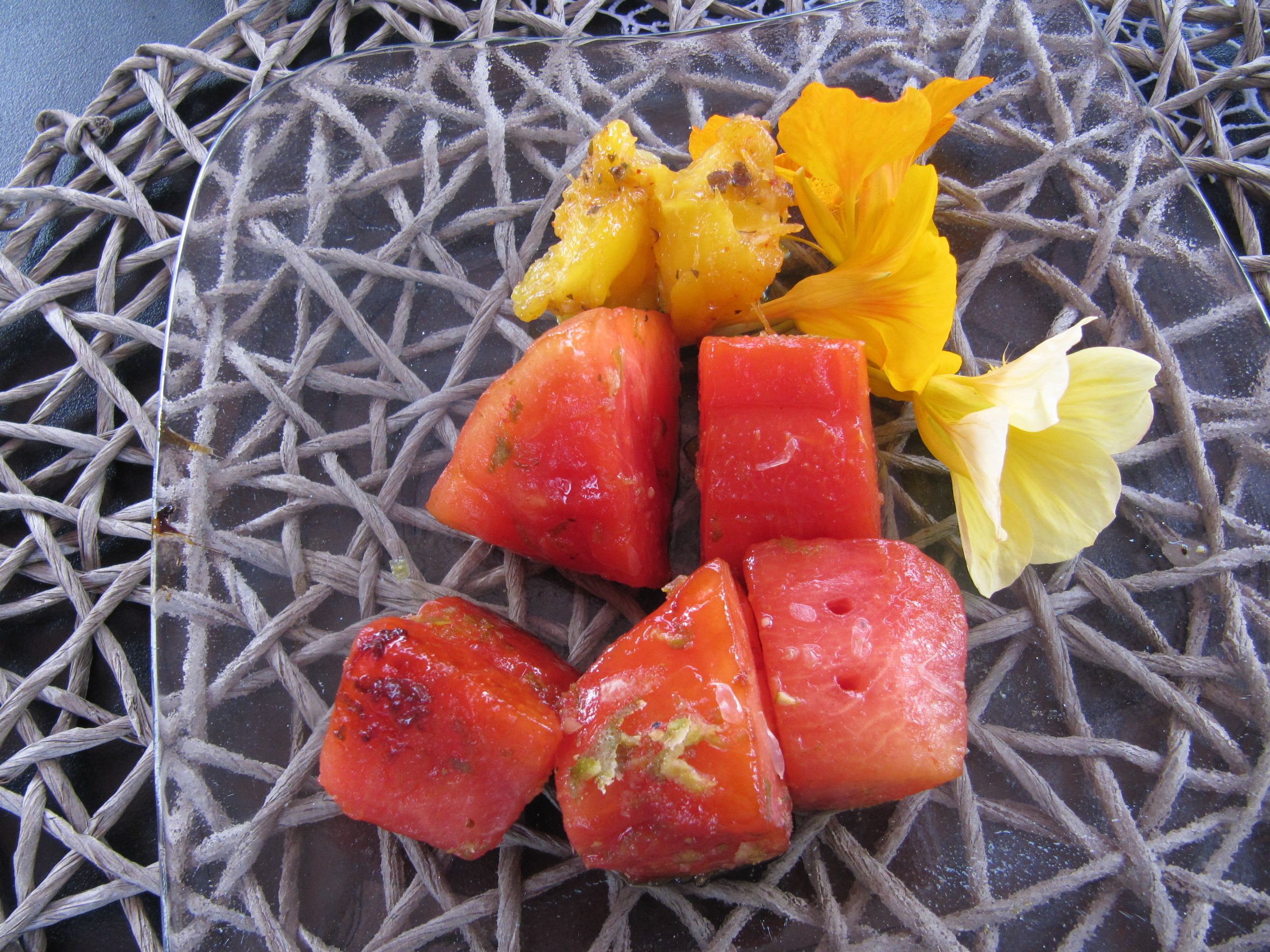 heute gibt´s wieder einmal Steaks. Auf der Sizzle-Zone des Napoleon Gasgrills zubereitet, schmecken sie allerdings so gut daß jetzt öfter welche gegrillt werden. Diesmal habe ich argentinisches Rumpsteak ausgewählt. Dazu Rosmarinkartoffeln und eine Gemüsepfanne im Wok zubereitet. Wassermelone und Mango habe ich bis jetzt noch nicht gegrillt. Als Obstspieße ergaben sie ein wunderbares Dessert !