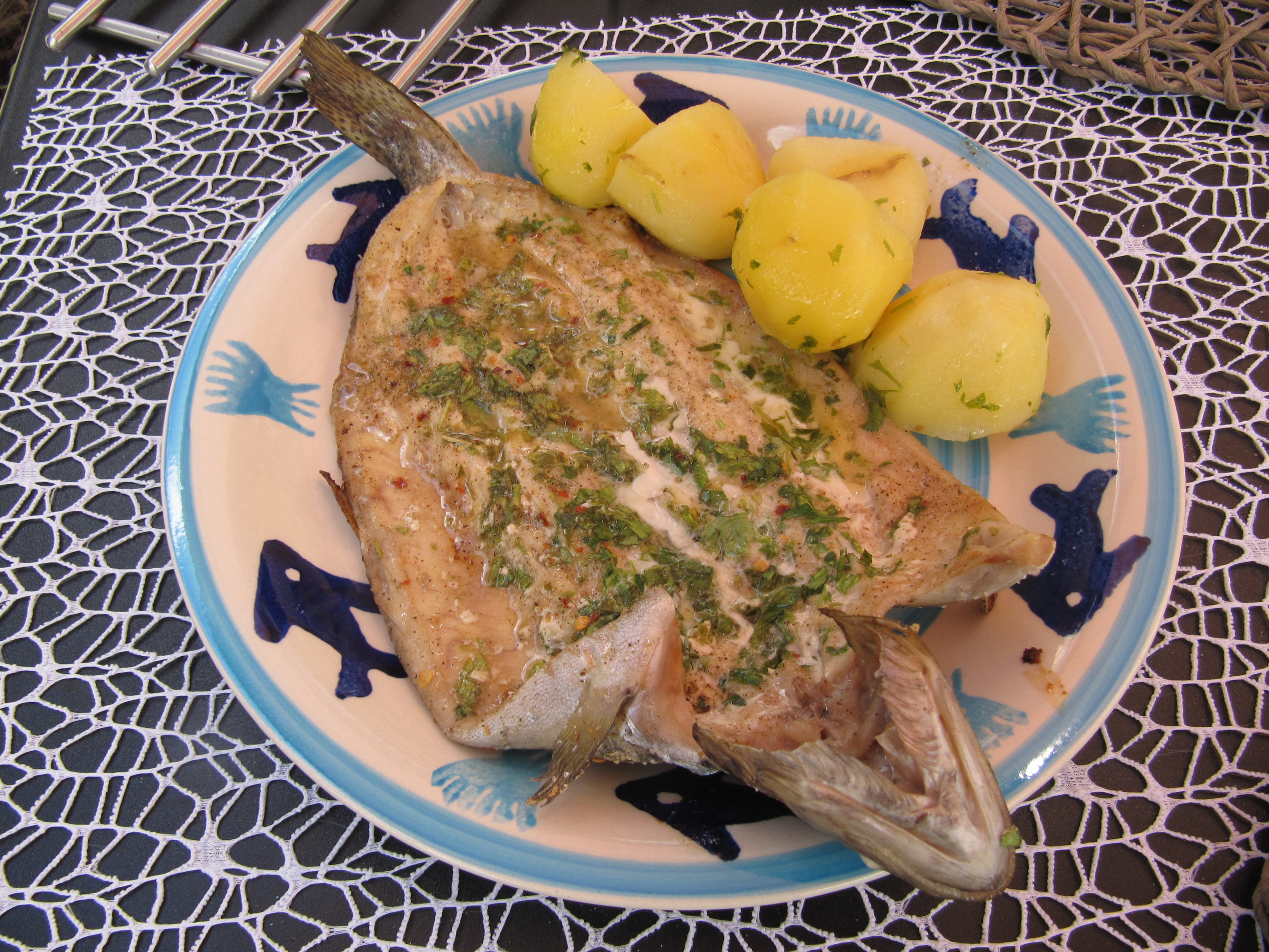 heute gibt´s Forelle, die auf der Gußeisen-Wendeplatte von Napoleon zubereitet wurde. Durch den speziellen Schnitt ist sie schon nach 8 Min. fertig gegart. Petersilkartoffeln und Salat als Beilage, und ein köstliches Gericht war fertig ! (Aus dem Buch „Grillen mit Adi und Adi„)