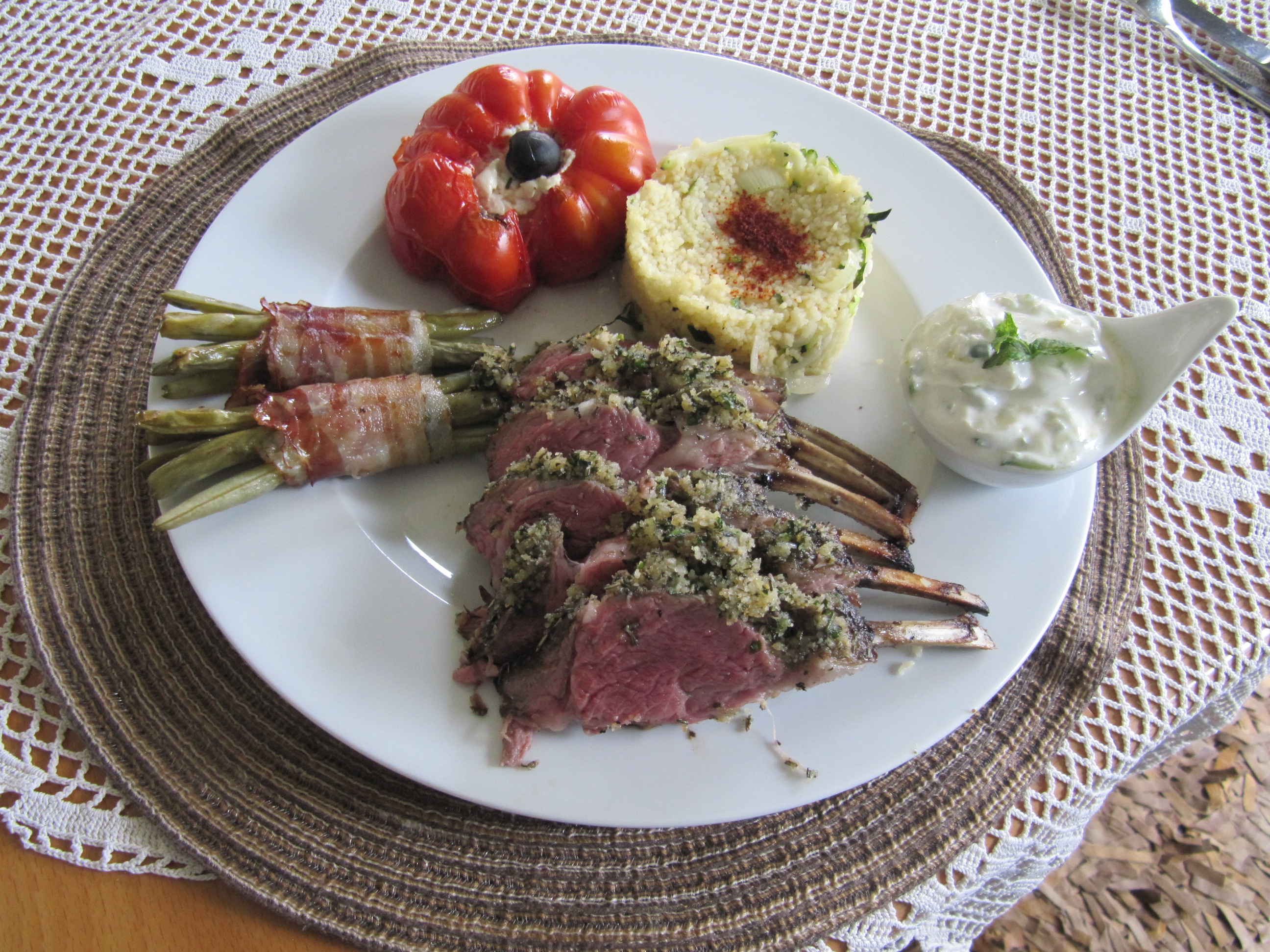 heute gibt´s endlich Lammkrone (es war schon länger geplant, diese zu grillen !). Ich wurde dabei von einem Rezept von Adi Matzek „Lammrücken mit Kräuterkruste“ aus dem Buch „Meister am Grill“ inspiriert. Couscous, gefüllte Tomaten , Speckbohnen und Tsatsiki wurden von meiner Gattin (Kochblog „gourmeetme„) zubereitet.