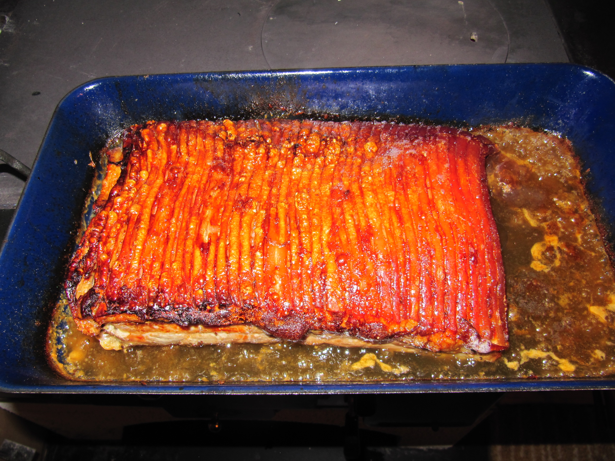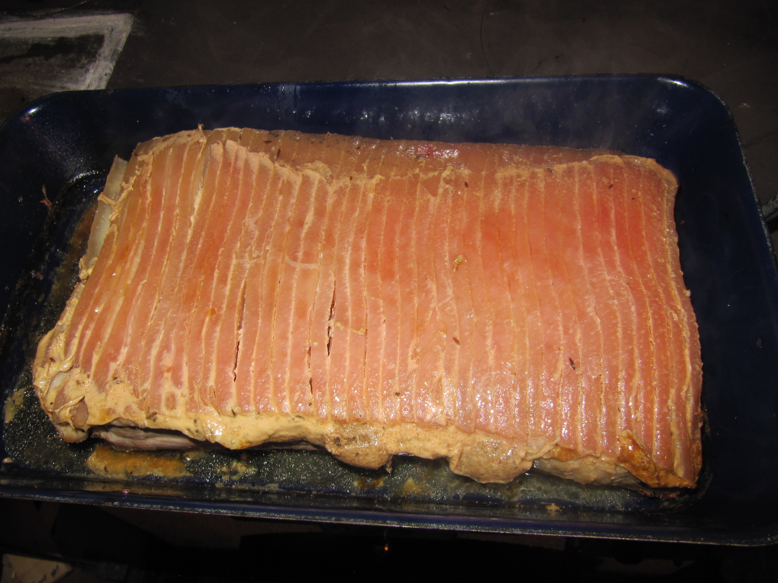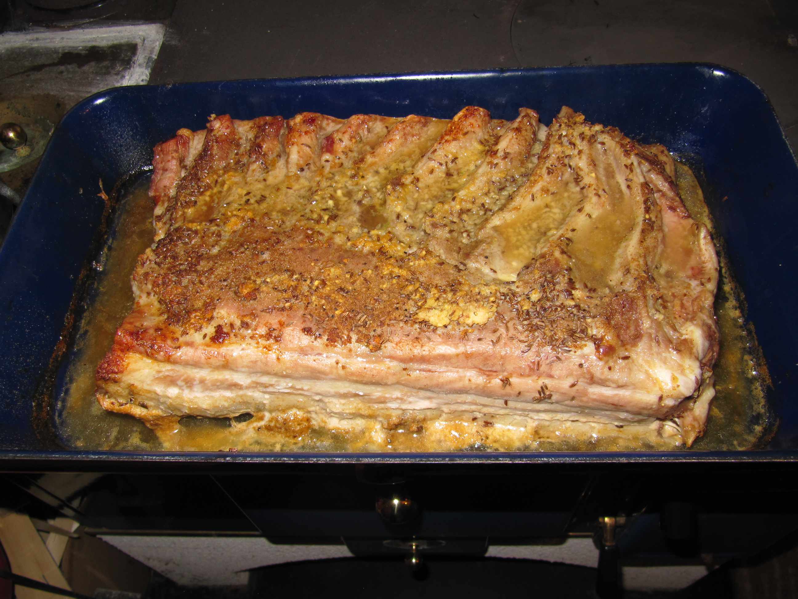 3,5 kg Bauchfleisch, mit Schwarte ohne Knochen, geschröpft (oder selbst schröpfen), in einen Bräter legen. Mit Knoblauchpaste bestreichen (oder frischen Knoblauch dazu verwenden), mit ADI`S Bratl-Rub bestreuen und einmassieren. Über Nacht, gekühlt und abgedeckt, einziehen lassen. Dann etwas Bratenfett dazugeben und Suppe angießen. Mit der Schwartenseite nach unten ins vorgeheizte Backrohr schieben. (Zeit und Temperatur gebe ich keine an, diese werden durch vorhandenes Holz und Zulufteinstellung bestimmt. Öfter mal nachsehen, dann kriegt man Erfahrung mit dem Ofen !) Nach ca. 1 Std. Braten wenden. Nach ca. einer weiteren Std. Temperatur durch Zugabe von Holzscheiten und öffnen der Zuluft erhöhen um die Schwarte knusprig zu kriegen ! Während der Zubereitung immer wieder Suppe zugießen um ausreichend köstlichen Saft zu erhalten.