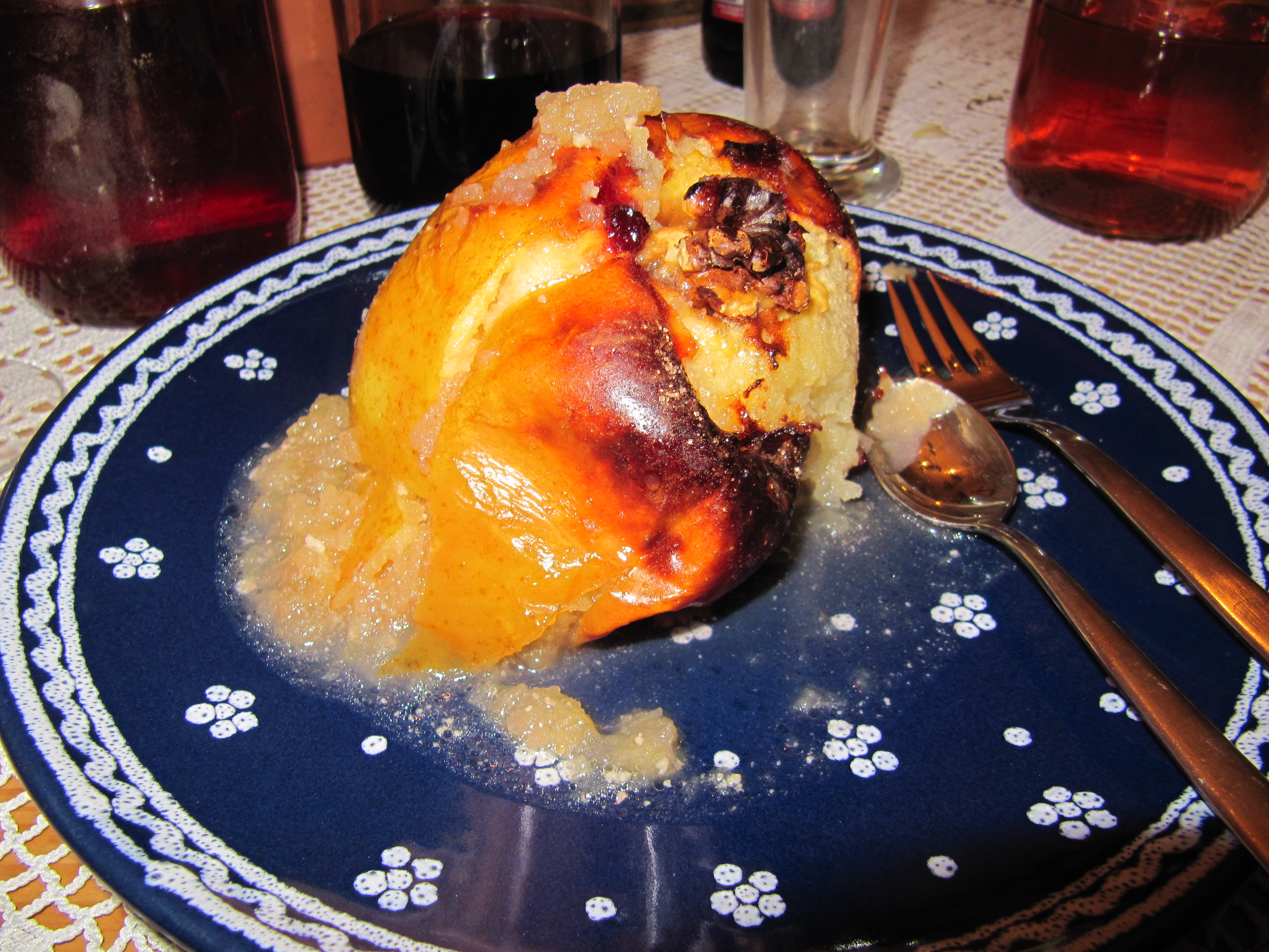 Als Vorspeise gab es Kürbiscremesuppe mit Kernöl, Kürbis-Chips (selbstgemacht) und Chilifäden. Als Nachspeise einen Bratapfel (Tipp: Boskop Äpfel passen dafür am Besten !) mit Nüssen, Rosinen, Marzipan, Preiselbeeren und Honig Fülle. Es hat allen wirklich vorzüglich geschmeckt. Danke an meine Gattin, dieses Menü wurde von ihr zubereitet.