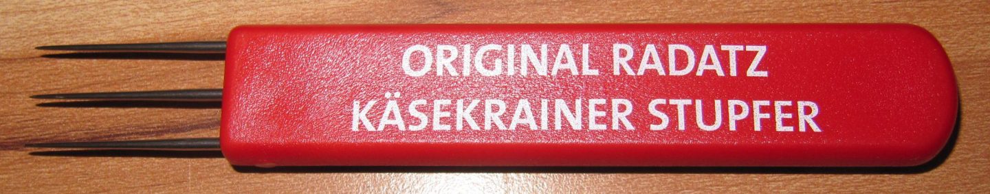 Lammschulter und Speck grob würfeln. Mit den Gewürzen und dem Olivenöl vermischen. Fleischmischung mit Frischhaltefolie abdecken und rund 2 Stunden kalt stellen, damit die Gewürze schön durchziehen können. Danach alles durch den Fleischwolf (mittlere Scheibe) geben und mit den Händen durchkneten bis eine Bindung entsteht. Für die richtige Konsistenz kann noch Eiswasser eingearbeitet werden. Den Wurststopfaufsatz am Fleischwolf montieren, die Masse in den Darm abfüllen und bei gewünschter Länge abdrehen. Zur Füllung kann auch ein Wurststopfer verwendet werden. Bei Lufteinschlüssen im Darm hilft ein Käsekrainer-Stupfer, damit können kleine Löcher gestochen werden: