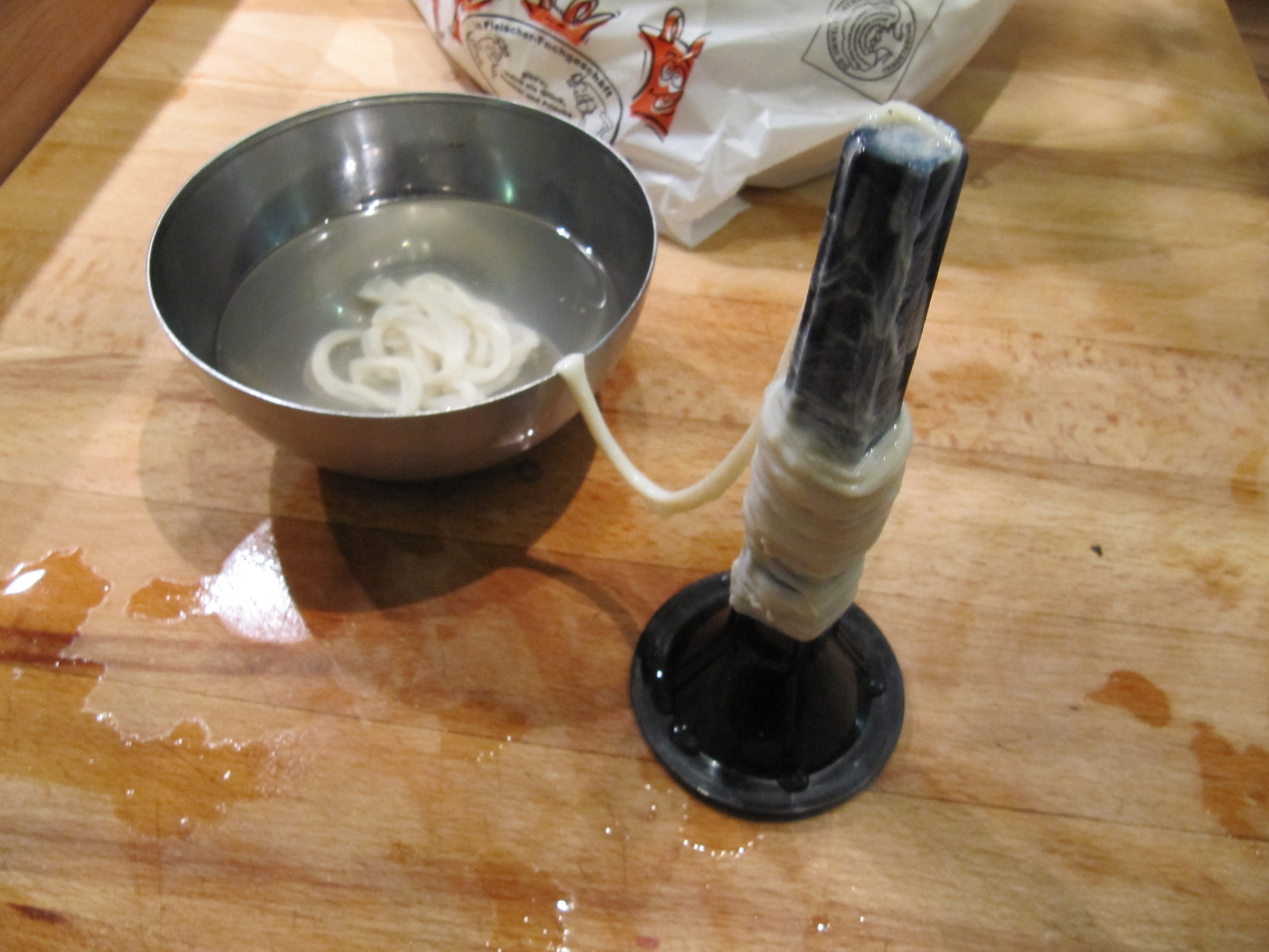 Darm vorbereiten: Den eingesalzenen Darm in eine Schüssel mit Wasser einlegen. Nach und nach den Darm herausfischen und das Wasser den Darm entsalzen lassen. Den entsalzten Darm über das Füllhorn ziehen und kühl stellen.