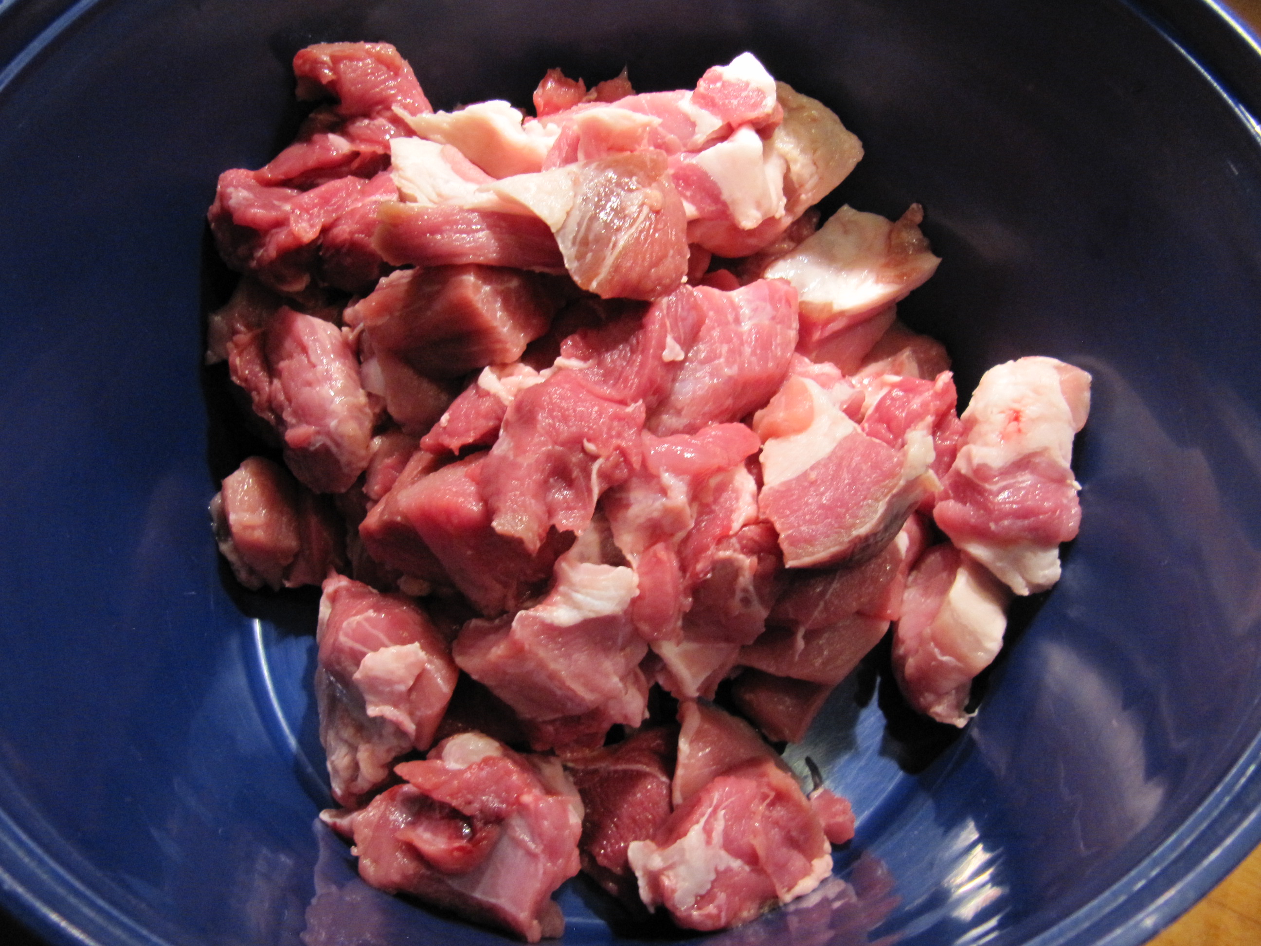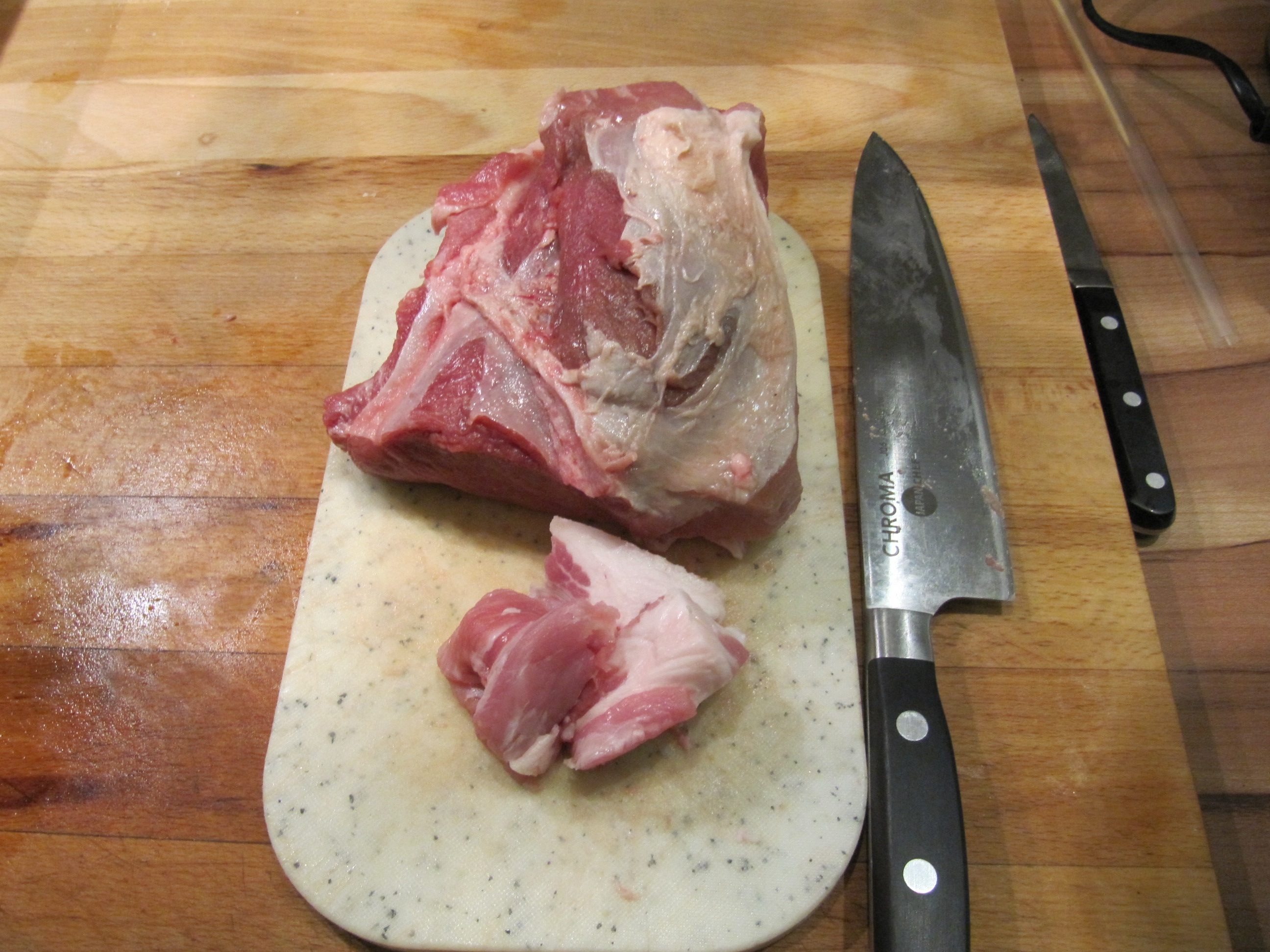 1500 g Hirschschnitzelfleisch (oder anderes Wildfleisch), 700 g Rückenspeck oder fettes Bauchfleisch vom Schwein (ich habe Göderl verwendet {Goder oder Schweinekinn}), 2 rote Zwiebeln, 2 Knoblauchzehen.