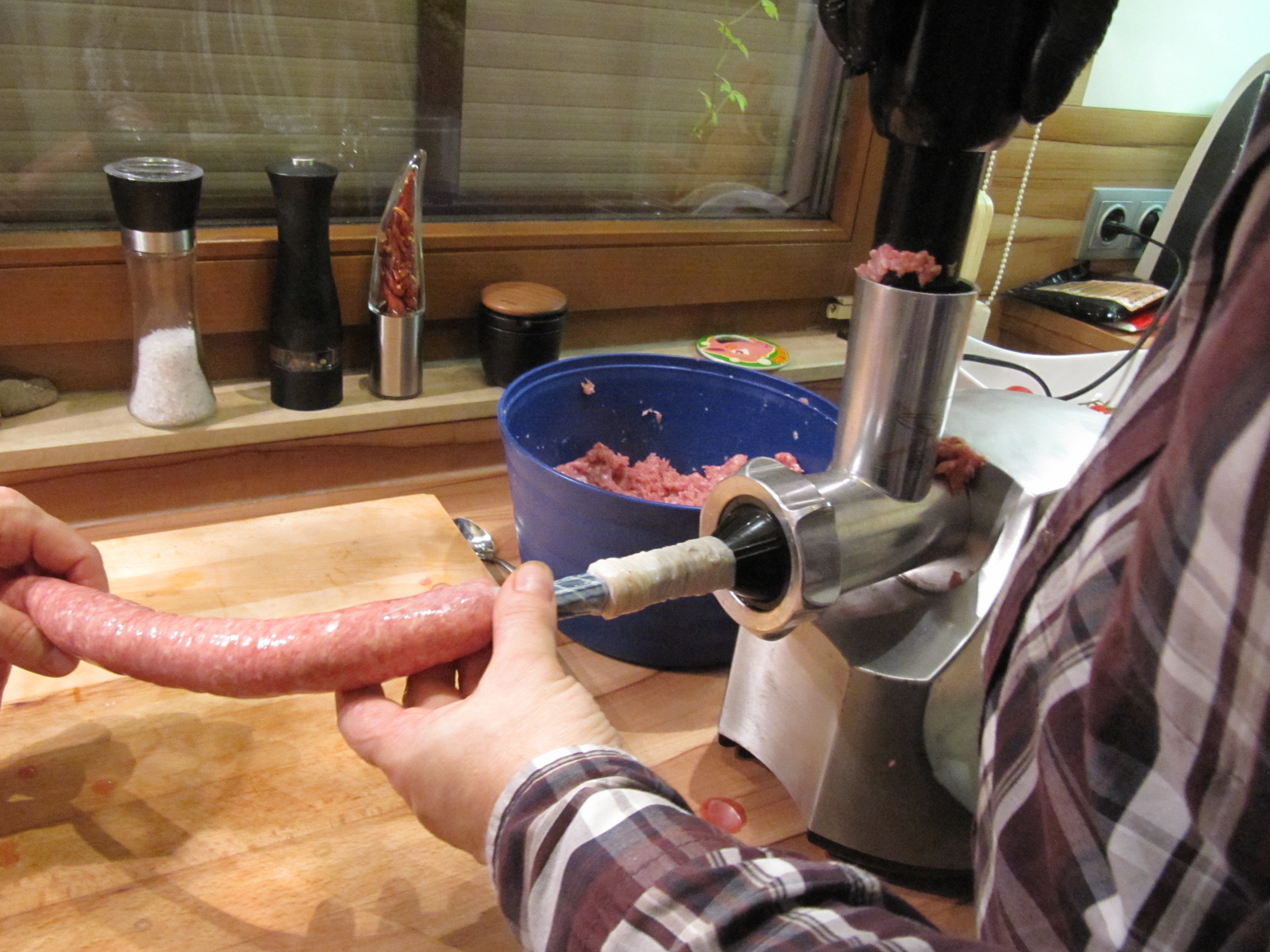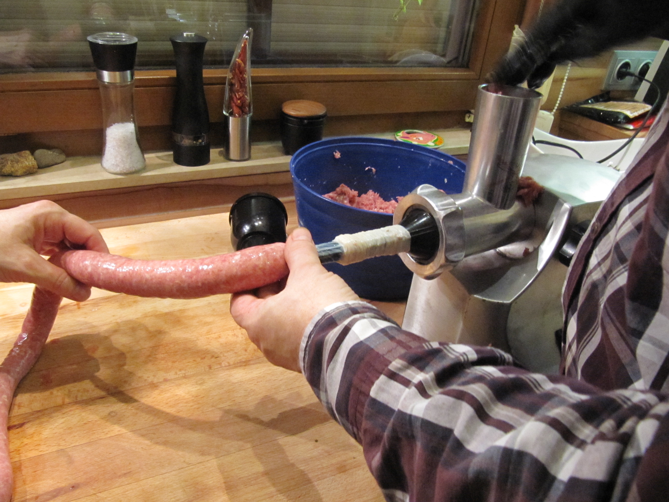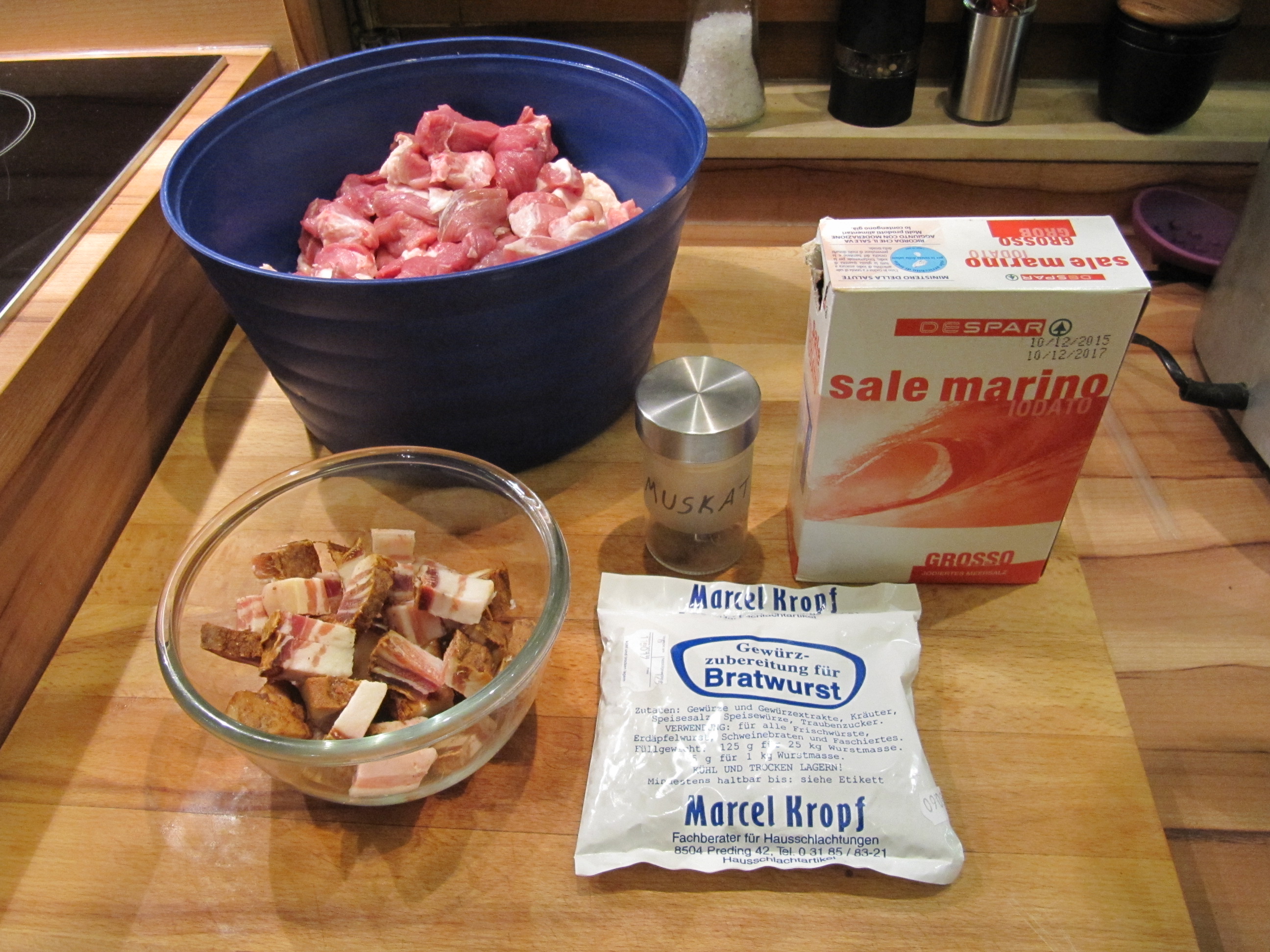 1 ganzer Schweinedarm (Dünndarm), 2 kg Schweineschulter ohne Schwarte mit 15-20 % Fettanteil (wenn möglich Freilandhaltung!). Bei zu mageren Fleisch wegen Bindung ein Stück Bauchspeck mitfaschieren (wolfen). 20 g reines Meersalz, 1 EL frisch gemahlener Pfeffer (oder Fertiggewürzmischung), 1 Prise frisch geriebene Muskatnuß.