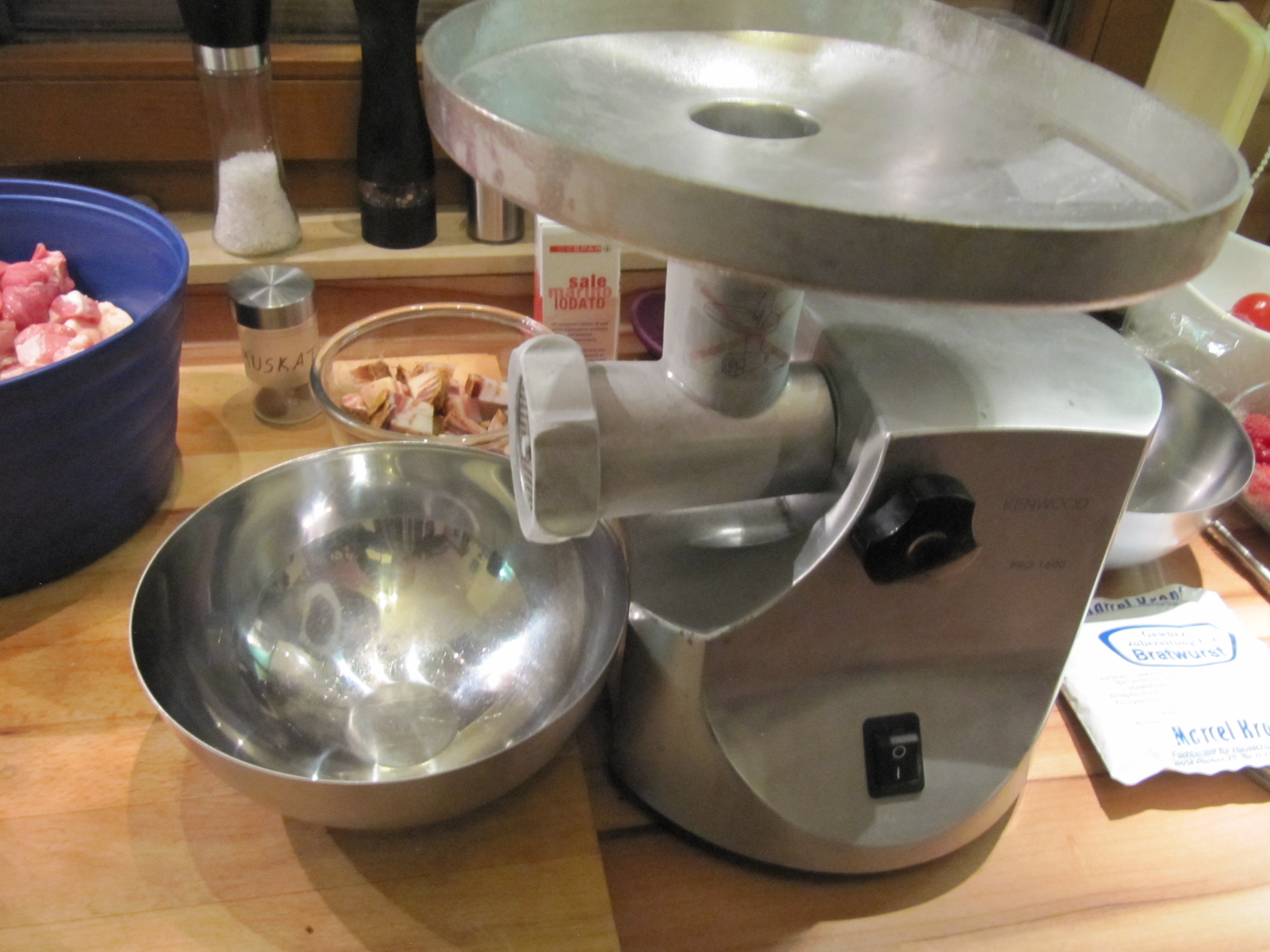 ich habe mich entschlossen, Bratwürste selbst herzustellen. Toulouser Bratwürste sollten es werden und auf Familienwunsch bis zum Jahreswechsel essfertig sein. Dies war mein erster Versuch, ist mir jedoch gut gelungen (nur einmal ist die Hülle geplatzt!). Da ich einen sehr guten Fleischwolf mit Wurststopfaufsatz habe, war´s nur mehr notwendig Fleisch, Darm und Gewürze einzukaufen. Nachfolgendes Rezept ergibt ca. 15 – 20 Würste.