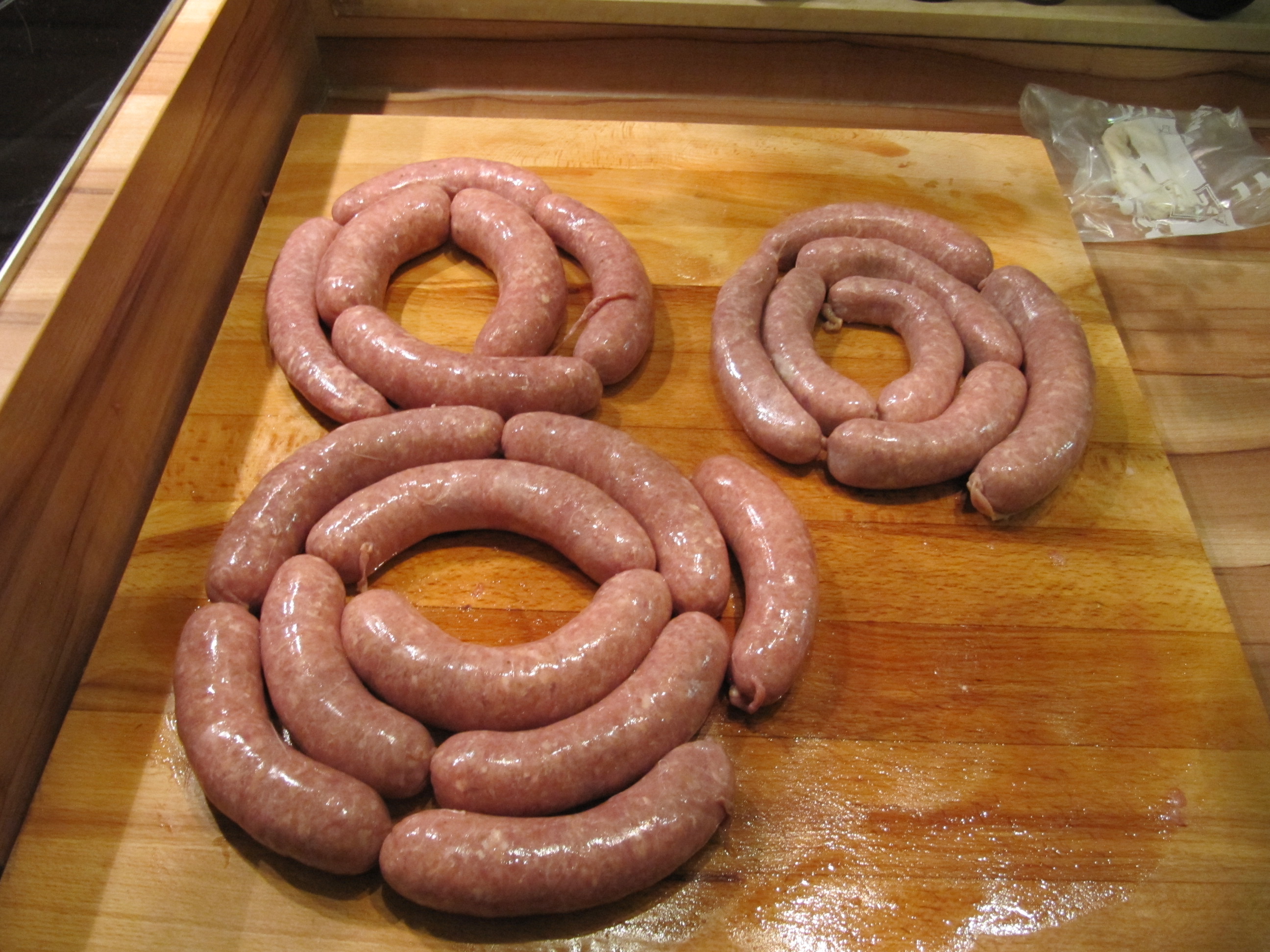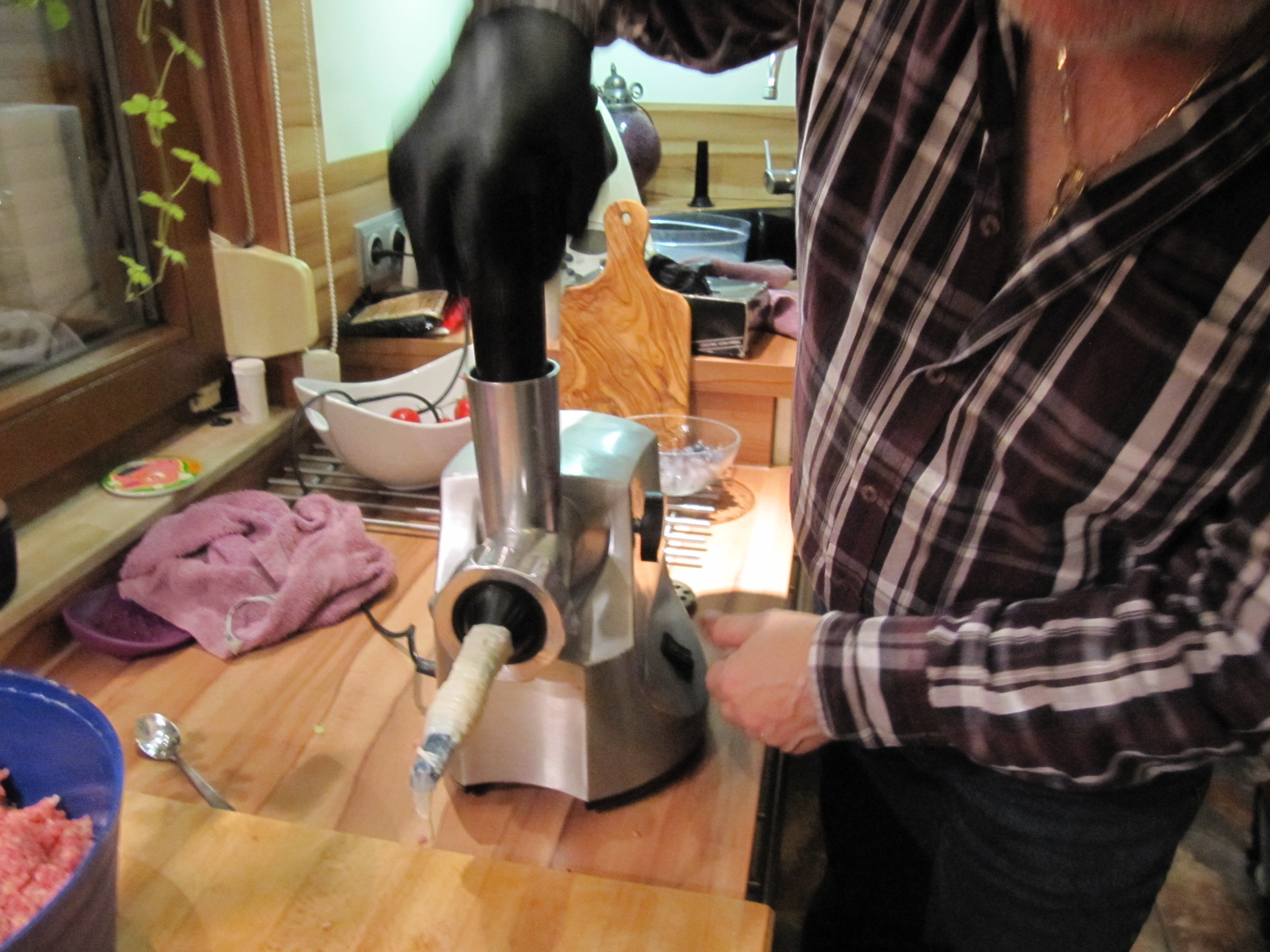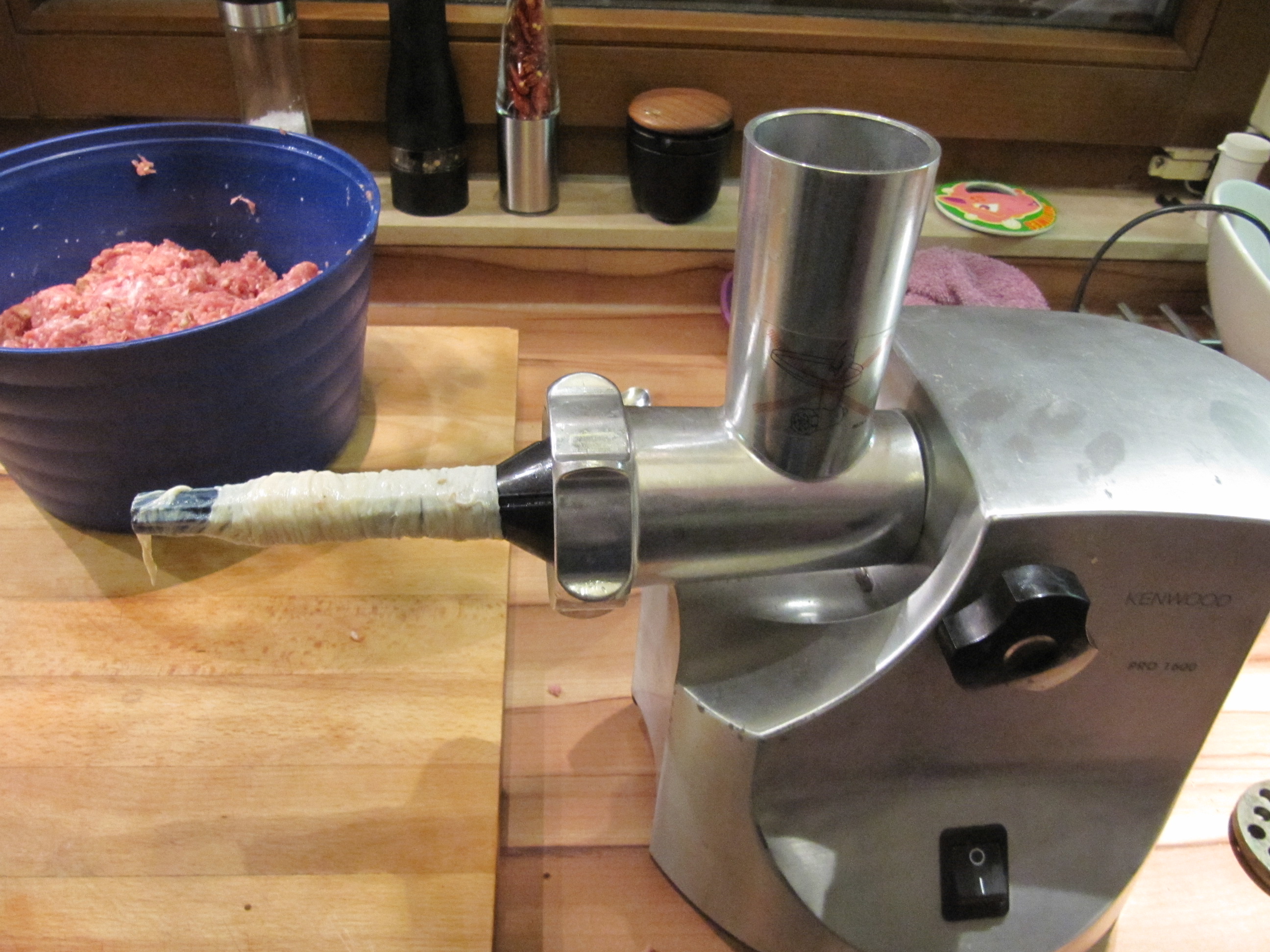 200 ml trockener Rotwein (ich habe Schilcher genommen, wegen der steirischen Note), 2 EL Gelee (Kirsch- oder Johannisbeergelee {ich habe ein, von meiner Schwiegermutter hergestelltes, Traubengelee verwendet}), (wer mag, kann auch noch 200 g gehackte Kastanien zum fertigen Brät mischen), Schweinedarm 28-32.