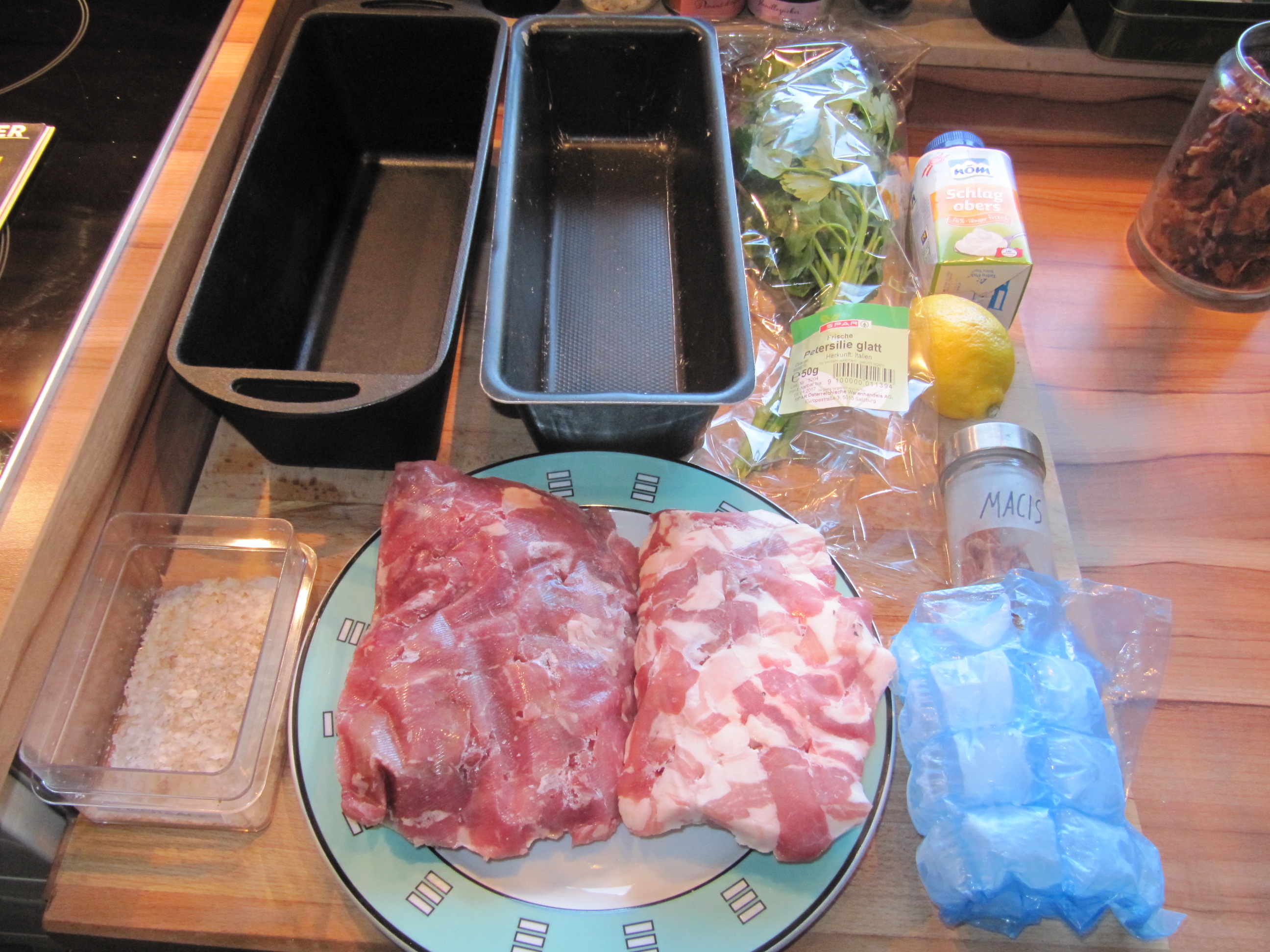 450 g Bauchfleisch vom Strohschwein (noch besser Mangalitza-Schwein), 400 g Fleisch vom Kalbshals, 300 g Eiswasser, 1 TL Macisblüten (Muskatblüten), 1/2 TL schwarzer Pfeffer (z.B. Kubebenpfeffer), 1 EL grobes Meersalz (z.B. Maldon Meersalzflocken), 1 TL geriebene Zitronenschale, 1/8 l Schlagobers.